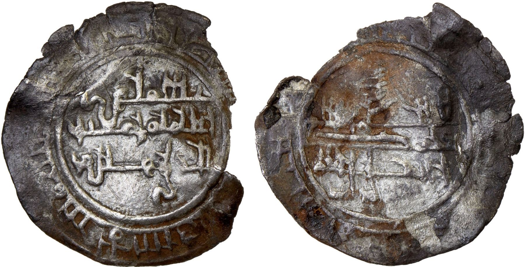 FATIMID: al-Mu'izz, 953-975, AR fractional dirham (0.46g), Tanja, A-699T, central legend al-imam ma'add abu tamim amir al-mu'minin with mint/date in the margin // central legend unclear, possibly with the honorific phrase al-mansur at the bottom, margin almost entirely flat, chipped, probably unique, very crude VF, RRR. This is first reported Fatimid coin of Tanja (Tangiers) for al-Mu'izz, previous report for al-Qa'im (our Auction 53, lot 1848) and al-Mansur (our Auction 51, lot 198). The date is probably AH350, not 354 as previously suggested.