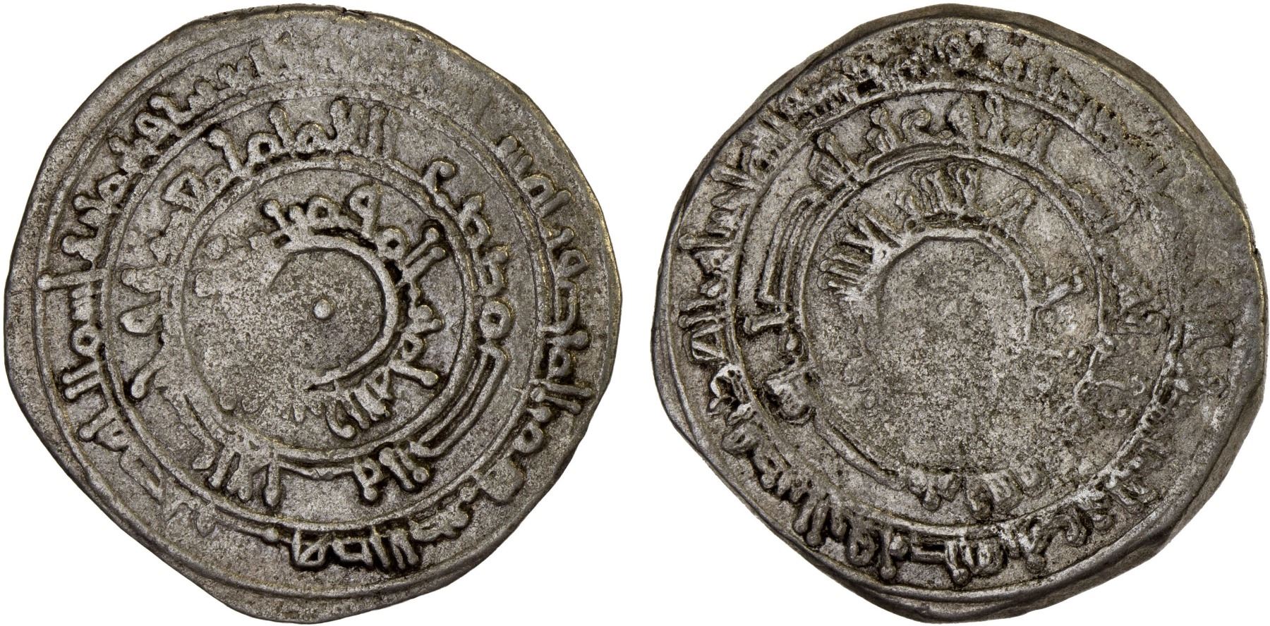 FATIMID: al-Mu'izz, 953-975, AR narrow dirham (2.89g), al-Mansuriya, AH348, A-X699, as Nicol-441 (½ dirham) but struck from broader dies, standard type A, but struck at the full weight of the traditional dirham; last digit of date weak but very likely "8", VF, RRR.