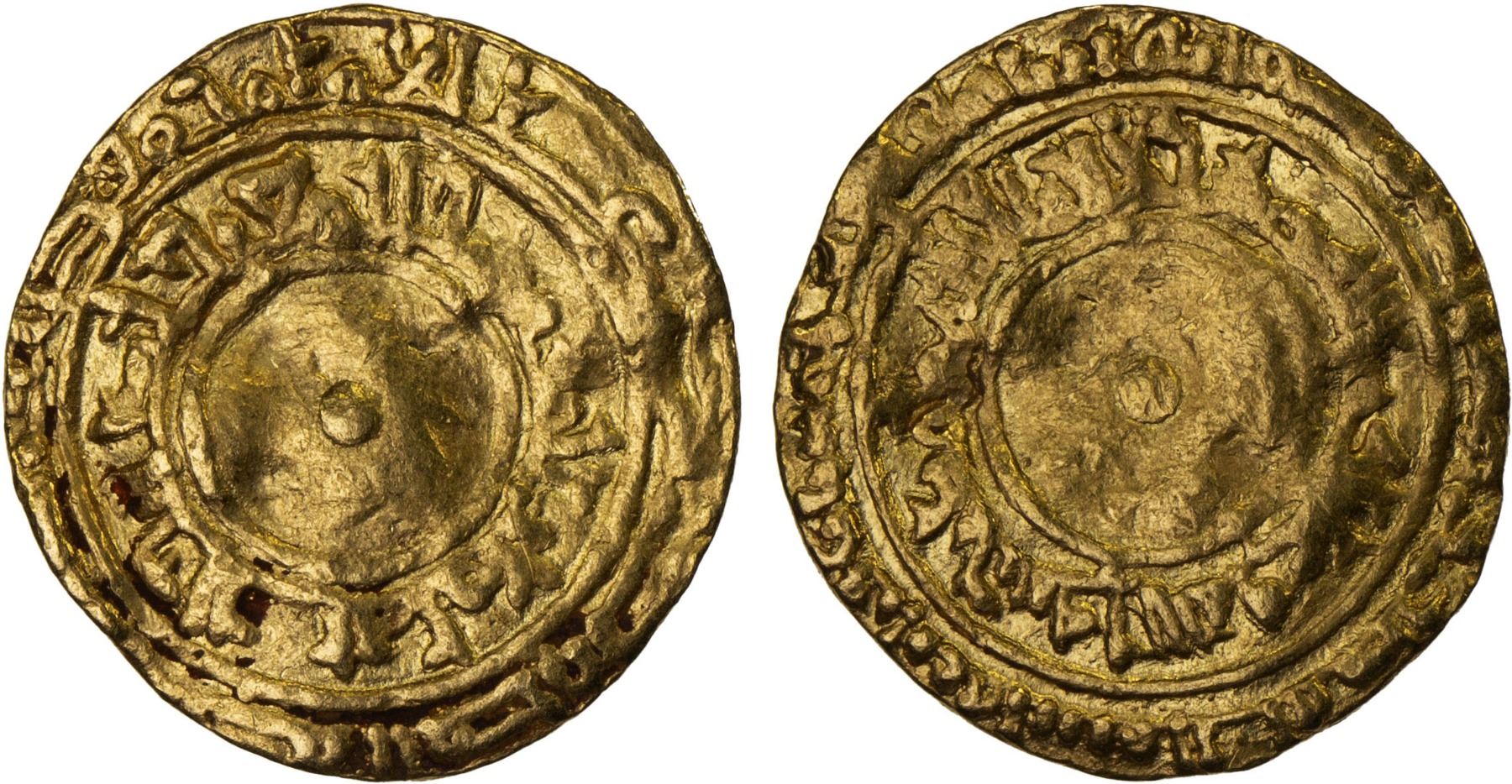 FATIMID: al-Mu'izz, 953-975, AV 1/4 dinar (1.05g), Siqilliya (Sicily), AH352, A-698, Nicol-301 (only 1 example reported by Nicol), mint/date formula in the outer marginal legend on the reverse; some weakness in the centers; date slightly weak but sufficiently clear, VG-F, RRR.