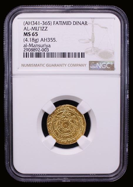 FATIMID: al-Mu'izz, 953-975, AV dinar (4.18g), al-Mansuriya, AH355, A-697, Nicol-412, fabulous strike, almost perfectly centered, perhaps the finest we have encountered for al-Mu'izz, NGC graded MS65.