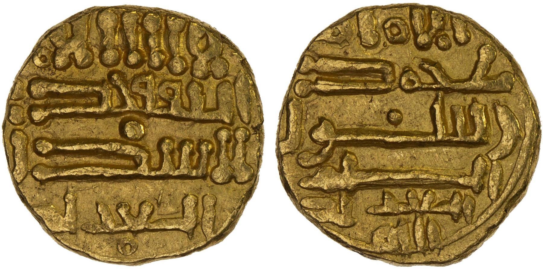 FATIMID: al-Mu'izz, 953-975, AV dinar (4.19g), NM, ND, A-697S-var, style identical to the contemporary Midrarid and Fatimid dinars of Sijilmasa, but without any marginal legends; the name below the obverse field is either al-'adâd for some unknown governor or al-'aziz for the next Fatimid Imam; unpublished and unique, XF, RRR.