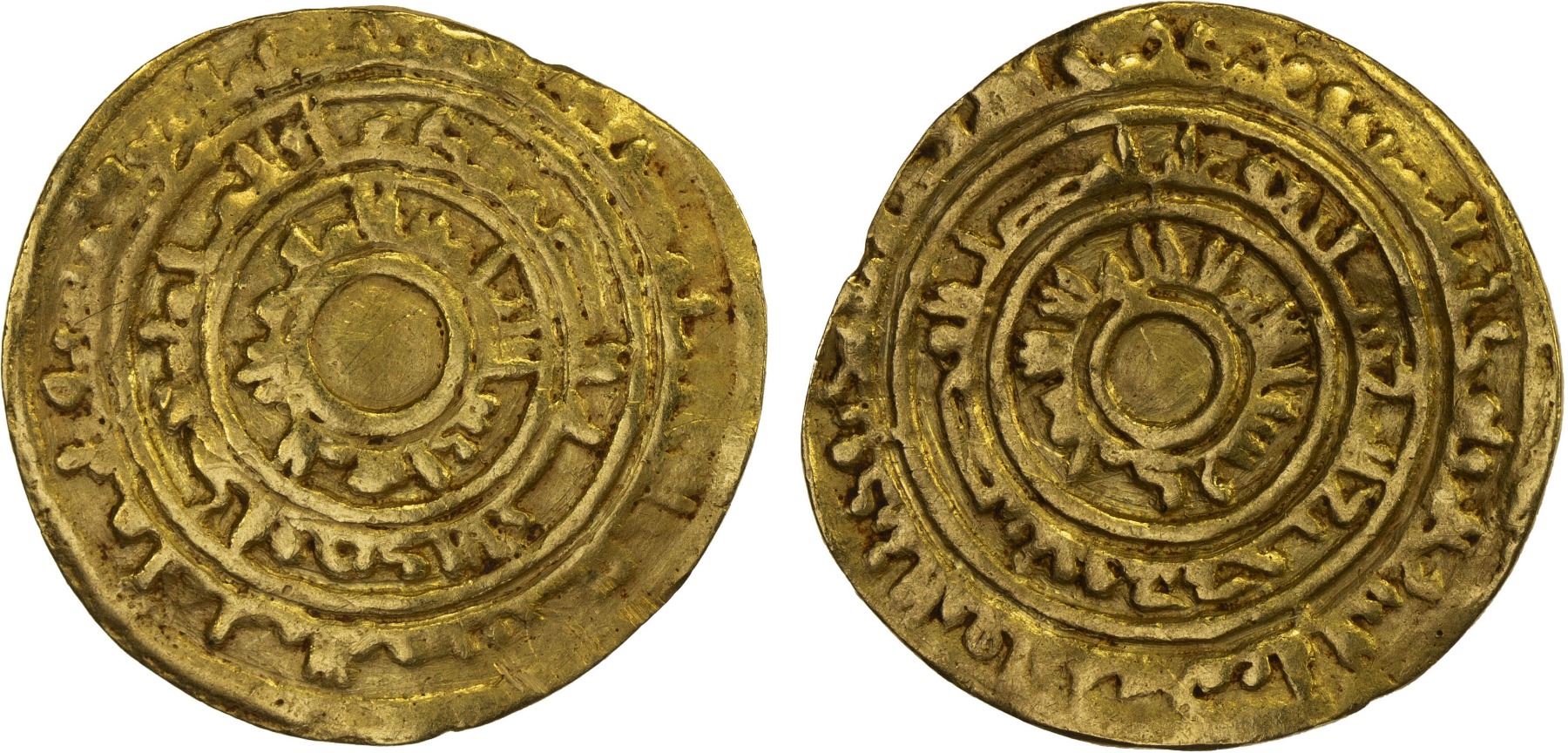 FATIMID: al-Mu'izz, 953-975, AV dinar (4.20g), al-Mansuriya, AH354, A-697, Nicol-410, interesting die-cutter's error, as the mint is inscribed with the letters "n" and "s" reversed, F-VF.