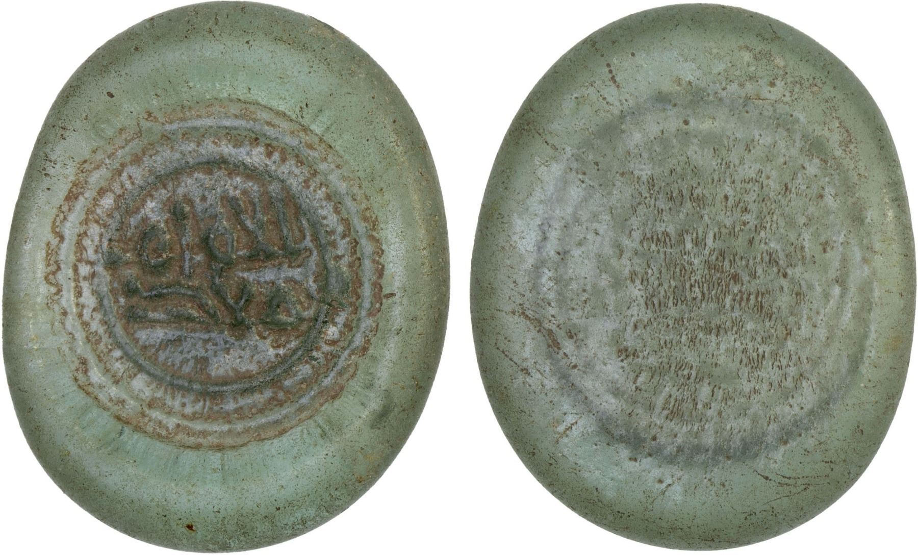 FATIMID: al-Mu'izz, 953-975, glass weight (jeton) (2.92g), A-702, FGJ-25, 2-line inscription al-imam ma'add within double circle, light green, translucent, bold impression, XF, RR, ex SARC Auction 12, lot 255, ex Ismail al-Imam Collection.