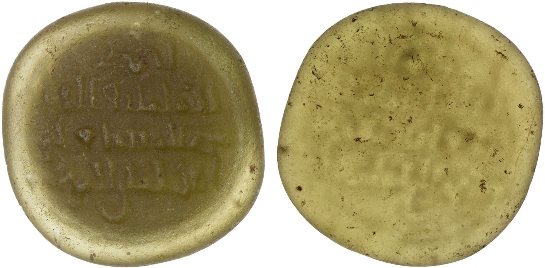 FATIMID: al-Musta'li, 1094-1101, glass weight (jeton) (4.13g), A-728, FGJ-346, legend ahmad / al-imam abu'l-qa- / -sim al-musta'li / billah amir al-mu'minin, bold legend but also slight porosity; brownish green, translucent, VF, RRR, ex Ismail al-Imam Collection.