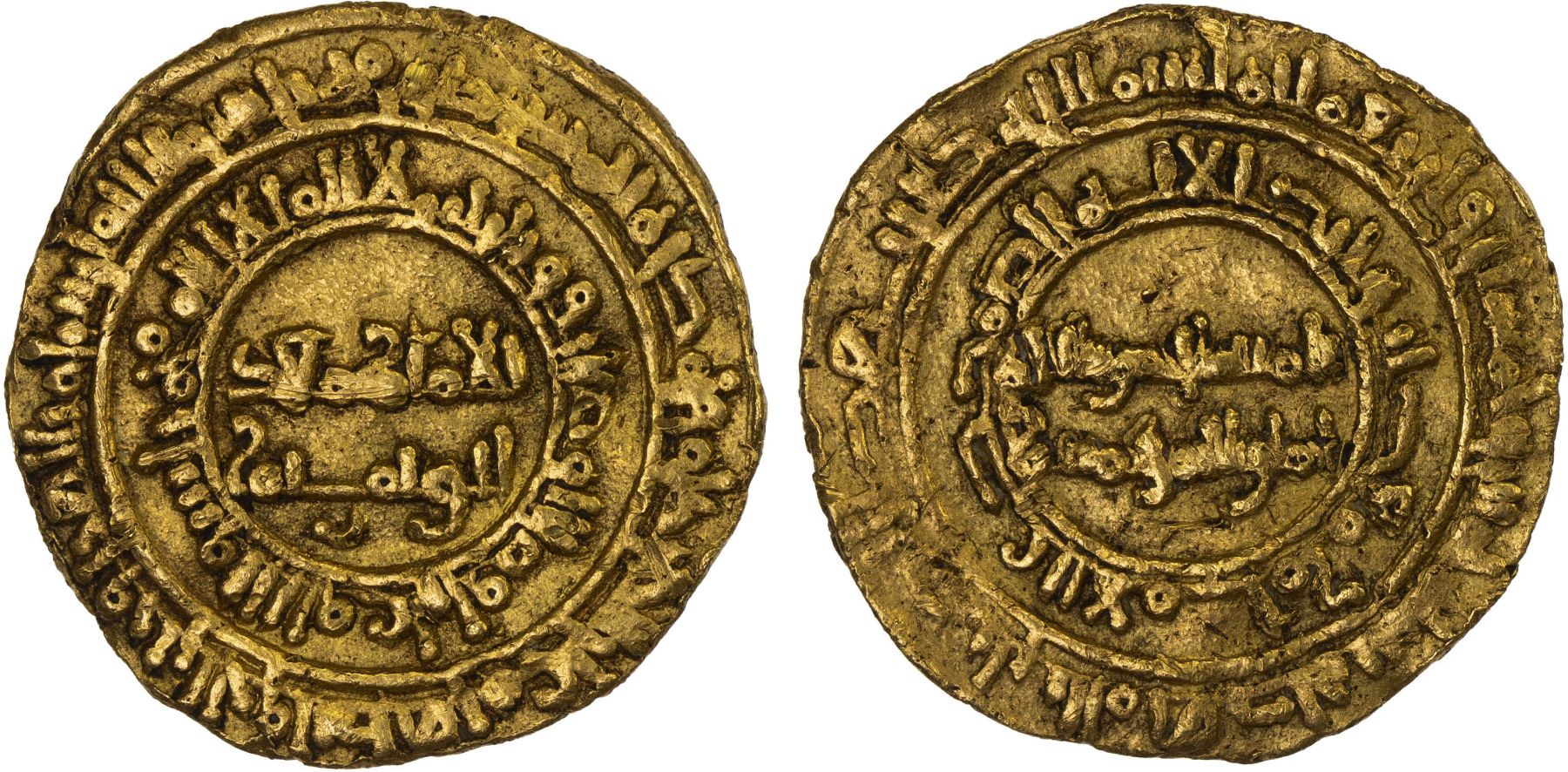 FATIMID: al-Mustansir, 1036-1094, AV dinar (3.78g), al-Mahdiya, AH455, A-719M, Nicol-2230 (type T1), rare type with two horizontal lines of legend with two concentric circular legends on both sides, struck only at al-Mahdiya, VF, RR.