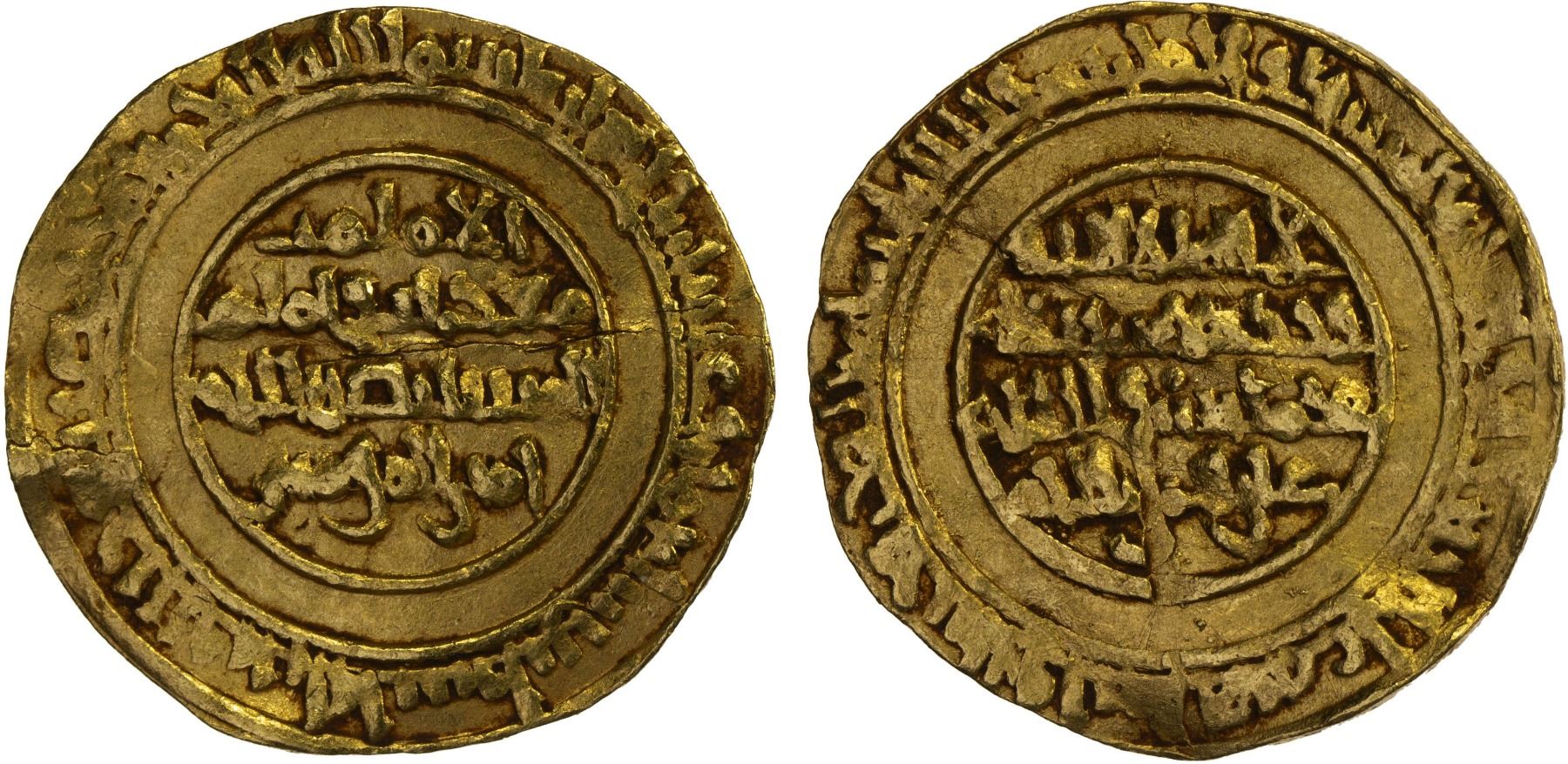 FATIMID: al-Mustansir, 1036-1094, AV dinar (4.08g), Filastin, AH428, A-719.1, Nicol-2060 (type A2, with mint/date formula on the obverse), mint & date sufficiently clear in the obverse margin, VF, RRR. The type with mint/date in the reverse field (Nicol-2059) is better known and also extremely rare.