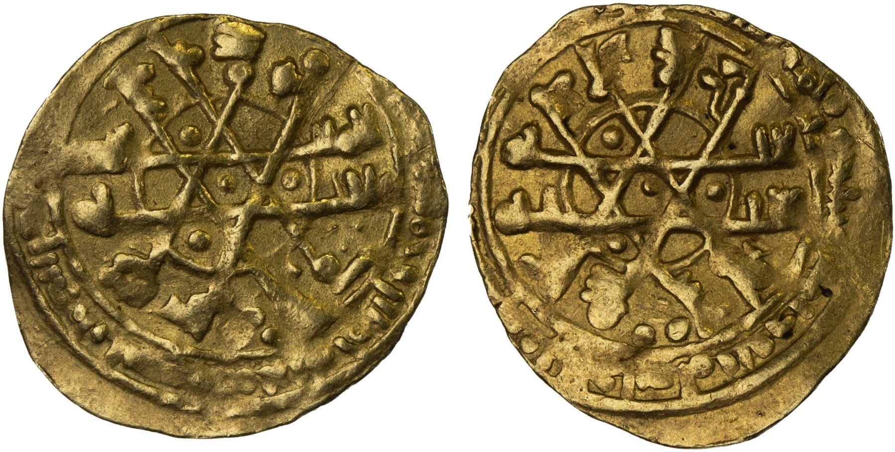FATIMID: al-Mustansir, 1036-1094, AV stellate 1/4 dinar (0.98g), Siqilliya (Sicily), AH(4)55, A-722, Nicol-1820/21, complex legend arrangement resembling a 6-point star, hence the term "stellate"; clear date, mint name weak but sufficiently legible, VF, RR.