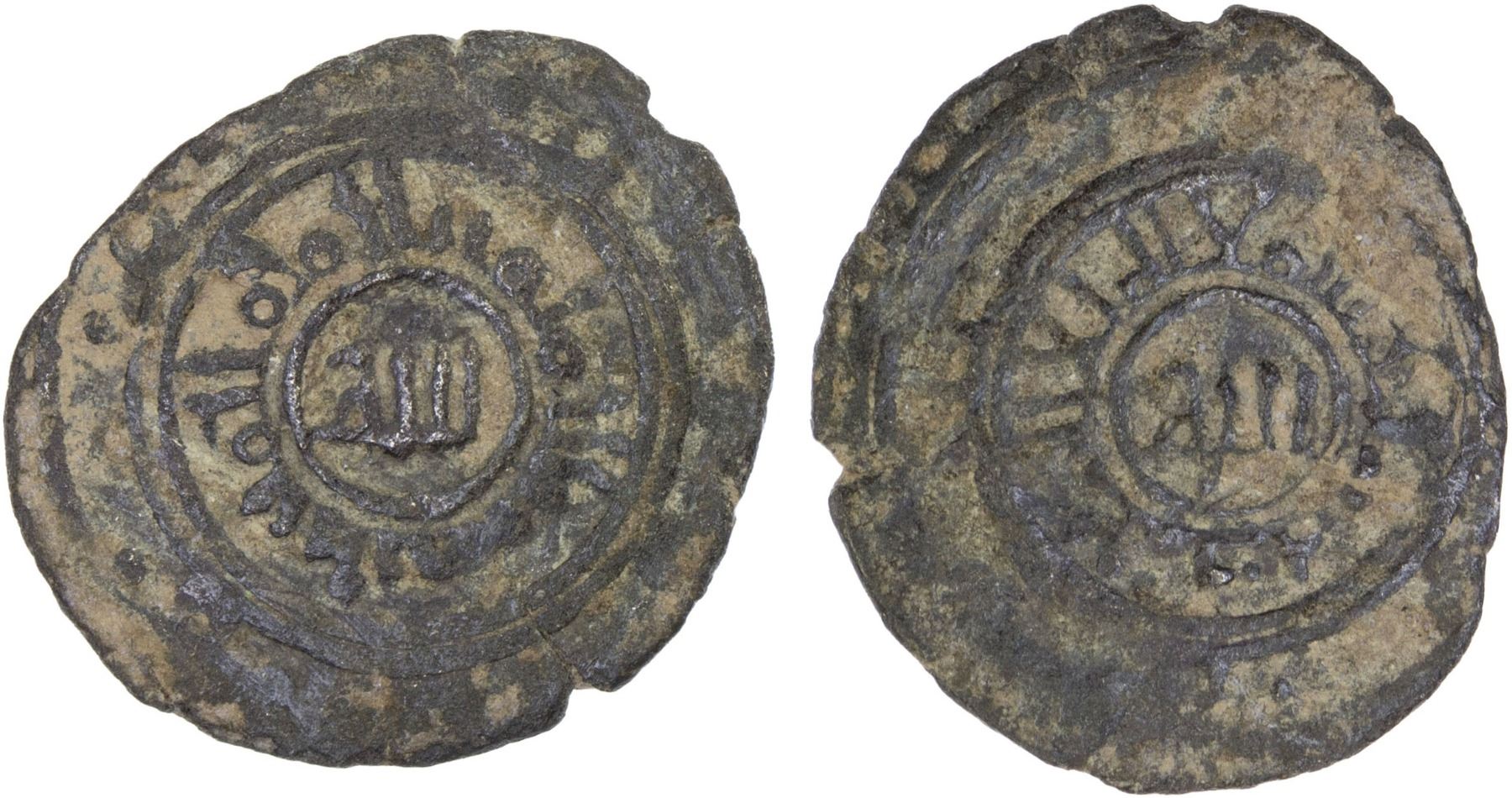 FATIMID: al-Mustansir, 1036-1094, BI dirham aswad (1.08g), NM, ND, A-723, triple marginal legend on both sides as on the gold type A-719A, both with Allah in the center, possibly with mint and/or date in the obverse outer margin (off flan), Fine, RR.