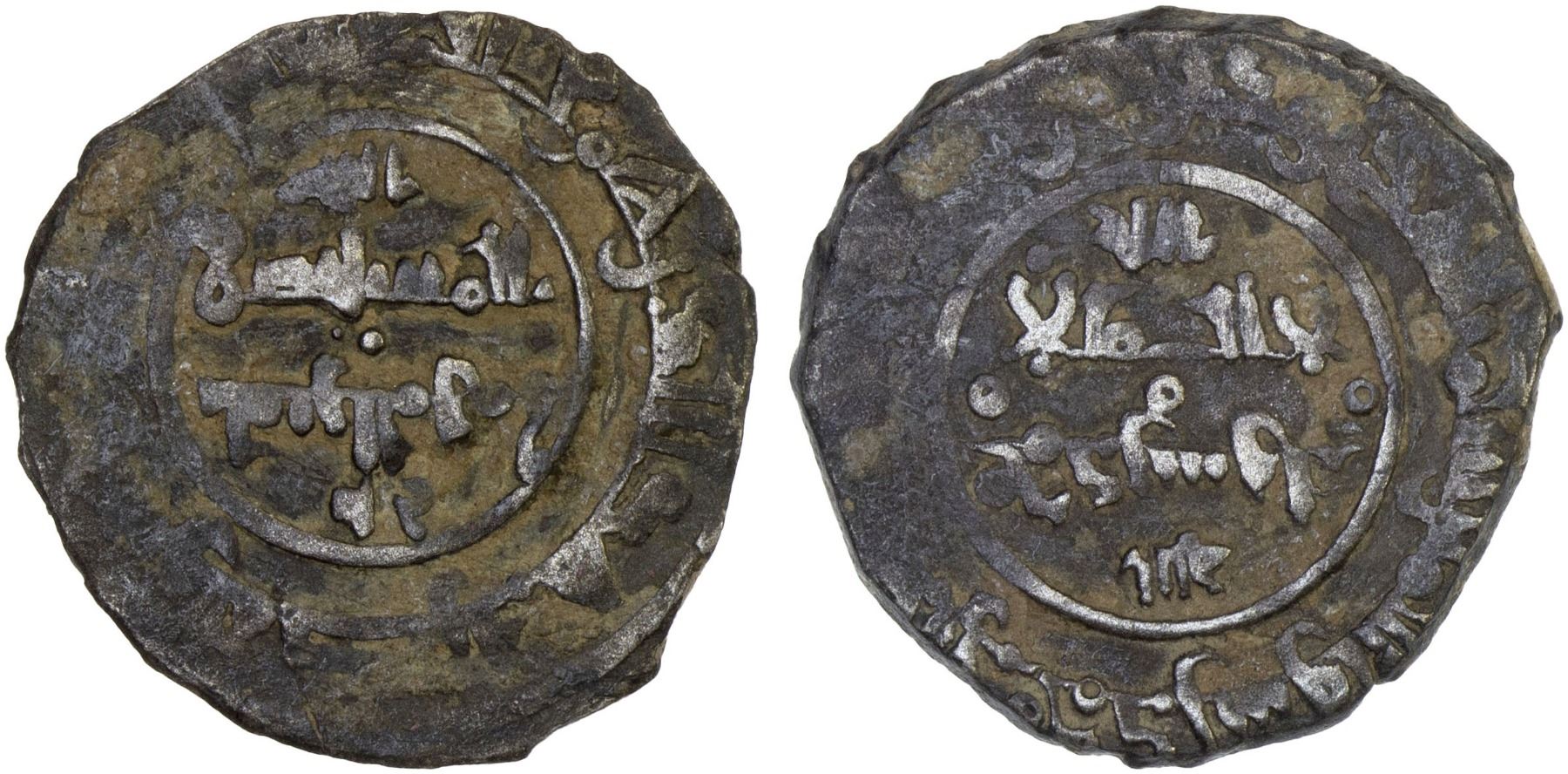 FATIMID: al-Mustansir, 1036-1094, BI dirham aswad (2.41g), Halab, DM/ND, A-723, two-line legend both sides, with the lower legend inverted, clear mint name, relatively good silver, Fine, RR.