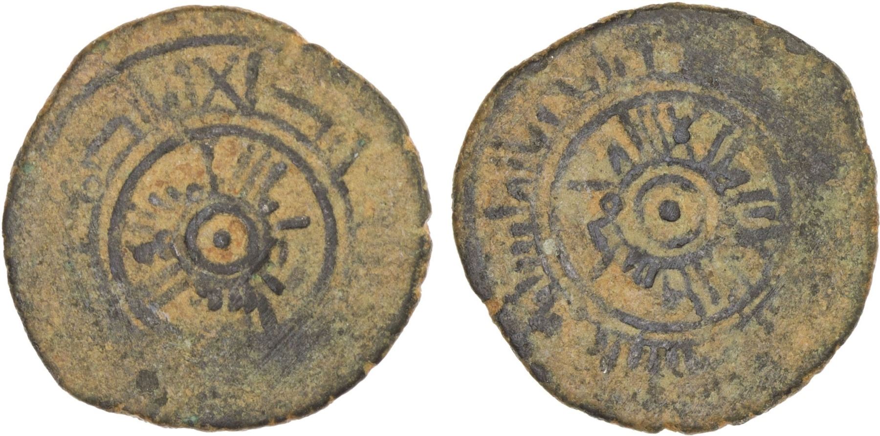 FATIMID: al-Mustansir, 1036-1094, BI fraction (2.05g), NM, ND, A-723S, design based on the gold dinar type A-719A, either with the outer marginal legends completely off flan or without any outer legend; slightly debased Arabic text, especially in the obverse inner legend, suggesting possible imitation in Sicily or southern Italy; a remarkable item in need of further research, VF, RRR.