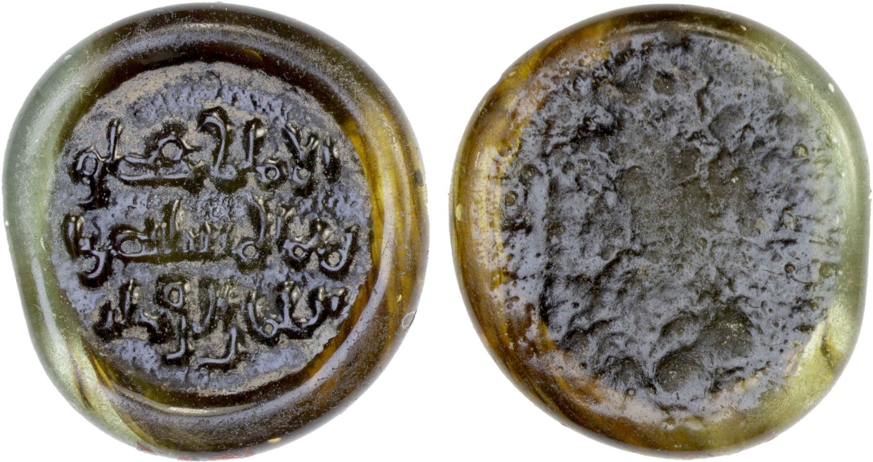 FATIMID: al-Mustansir, 1036-1094, glass weight (jeton) (2.90g), A-724, FGJ-262, ruler cited as al-imam ma'add abu tamim al-mustansir billah amir al-mu'minin almost no abbreviation in the legend; divided 1/2 area brown, the other 1/2 greenish light brown, translucent, excellent quality., bold XF-AU, RR, ex SARC Auction 12, lot 302, ex Ismail al-Imam Collection.