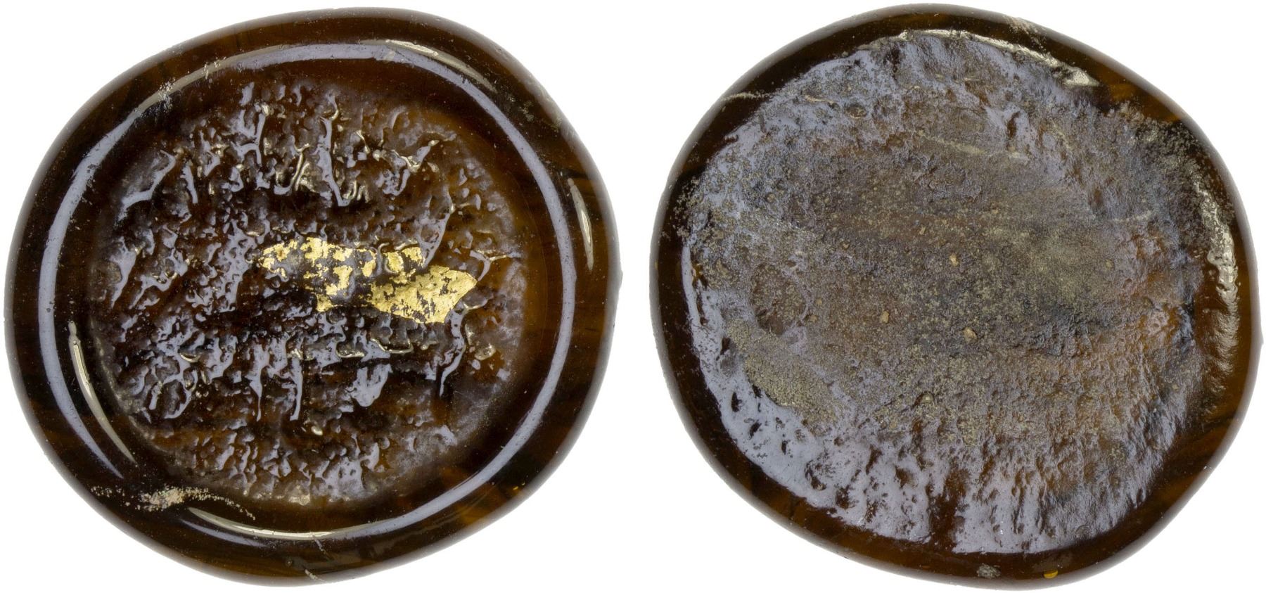 FATIMID: al-Mustansir, 1036-1094, glass weight (jeton) (2.94g), A-724, FGJ-262, ruler cited as al-imam ma'add abu tamim al-mustansir billah amir al-mu'minin; deep brown with one obverse small gold occlusion. modestly translucent, very rare color, VF-XF, R, ex SARC Auction 12, lot 304 (incorrectly called FGJ-264), ex Ismail al-Imam Collection. Crinkled central surface likely caused by removing the text stamp before the glass was sufficiently hardened.