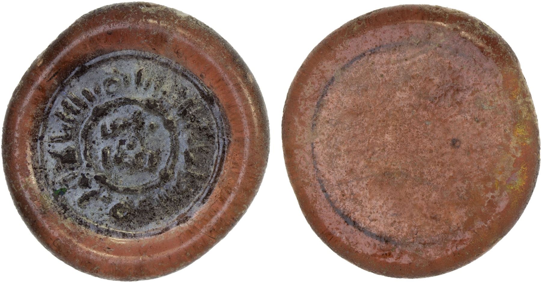 FATIMID: al-Mustansir, 1036-1094, glass weight (jeton) (2.99g), A-724, FGJ-298, circular legend al-imam ma'add abu tamim al-mustansir billah with amir al-mu'minin in the central circle, blank reverse; rose red, translucent, weakly cast, VF, ex SARC Auction 12, lot 310 (incorrectly called FGJ-299), ex Ismail al-Imam Collection.