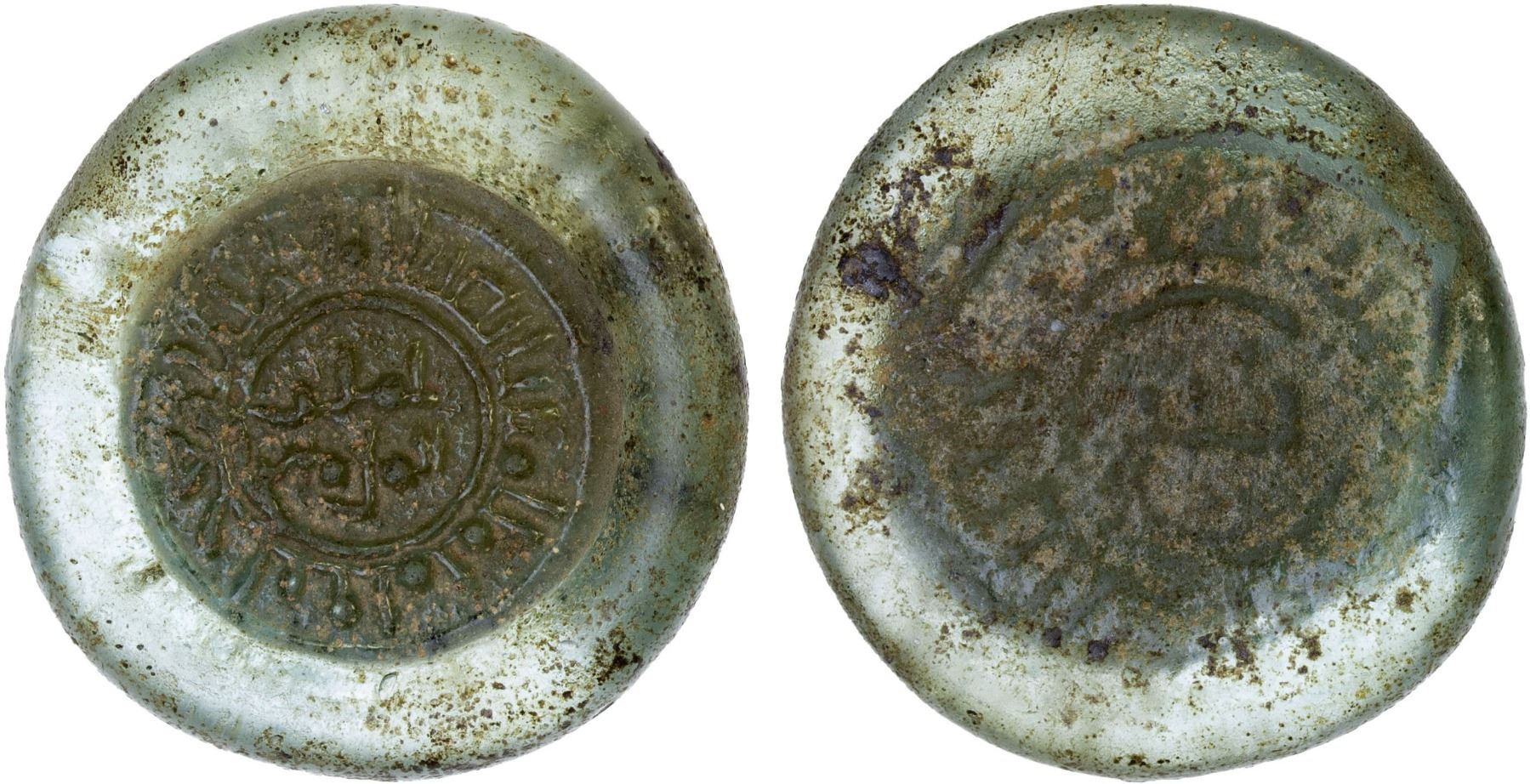FATIMID: al-Mustansir, 1036-1094, glass weight (jeton) (5.93g), A-724, FGJ-318, circular legend al-imam ma'add abu tamim al-mustansir billah with amir a/ l-mu'minin in the center // date written out in words, sana ithnayn wa thalathin wa arba' around, mi'a in the center, date week as always for this type, but sufficiently discernable; light green, translucent, some surface porosity; exceedingly rare type, VF, ex SARC Auction 12, lot 313, ex Ismail al-Imam Collection.