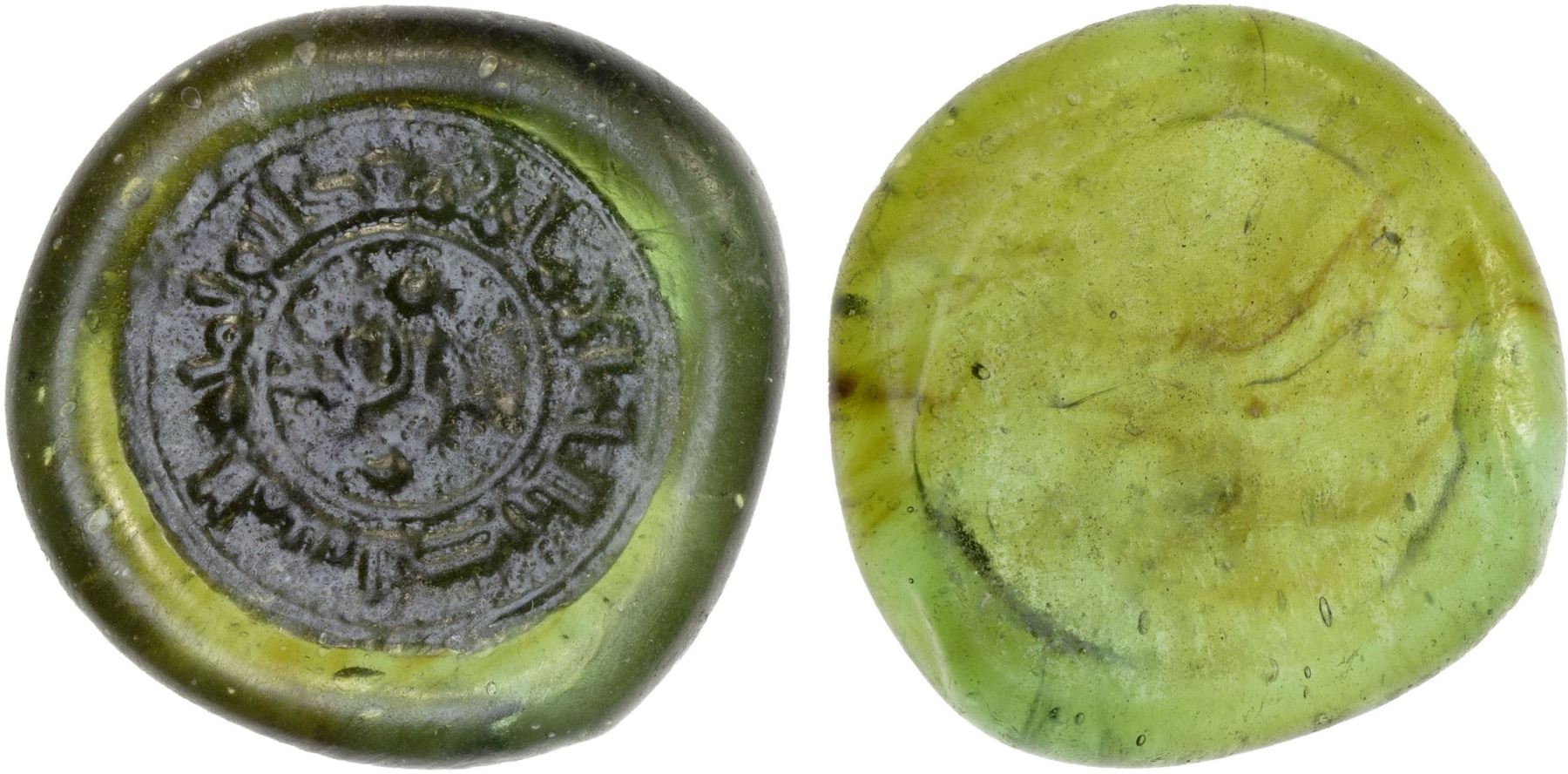 FATIMID: al-Mustansir, 1036-1094, glass weight (jeton) (5.94g), A-724, FGJ-310, circular legend al-imam ma'add abu tamim al-mustansir billah with horizontal amir al-mu'minin in the central circle with dot above and below the name, blank reverse; light green, translucent, XF, ex SARC Auction 12, lot 312, ex Ismail al-Imam Collection.