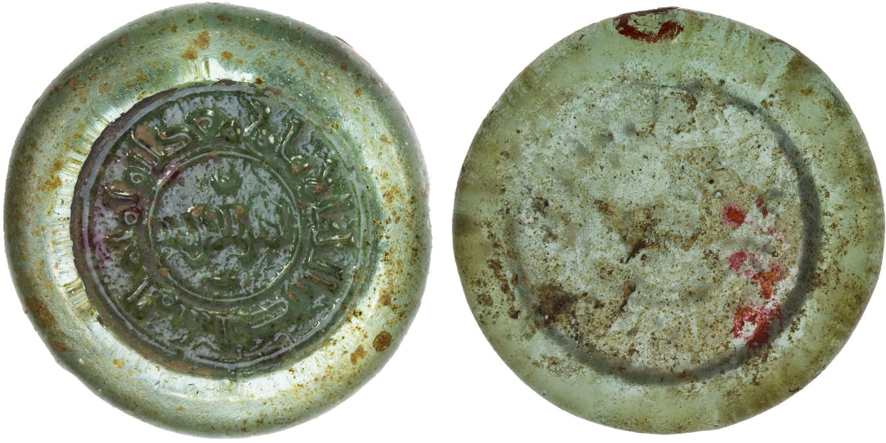 FATIMID: al-Mustansir, 1036-1094, glass weight (jeton) (5.98g), A-724, FGJ-310, circular legend al-imam ma'add abu tamim al-mustansir billah with horizontal amir al-mu'minin in the central circle with dot above and below that word, blank reverse; light green, translucent, XF, ex SARC Auction 12, lot 311, ex Ismail al-Imam Collection.