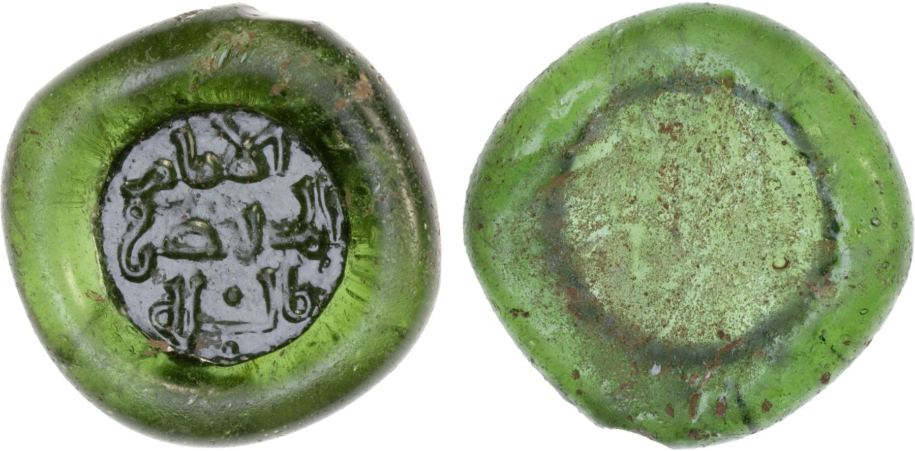 FATIMID: al-Mustansir, 1036-1094, glass weight (jeton) (6.03g), A-724, FGJ, 3-line inscription, al-imam / al-mustansir / billah, slightly dark green, beautifully cast, XF, ex Ismail al-Imam Collection.