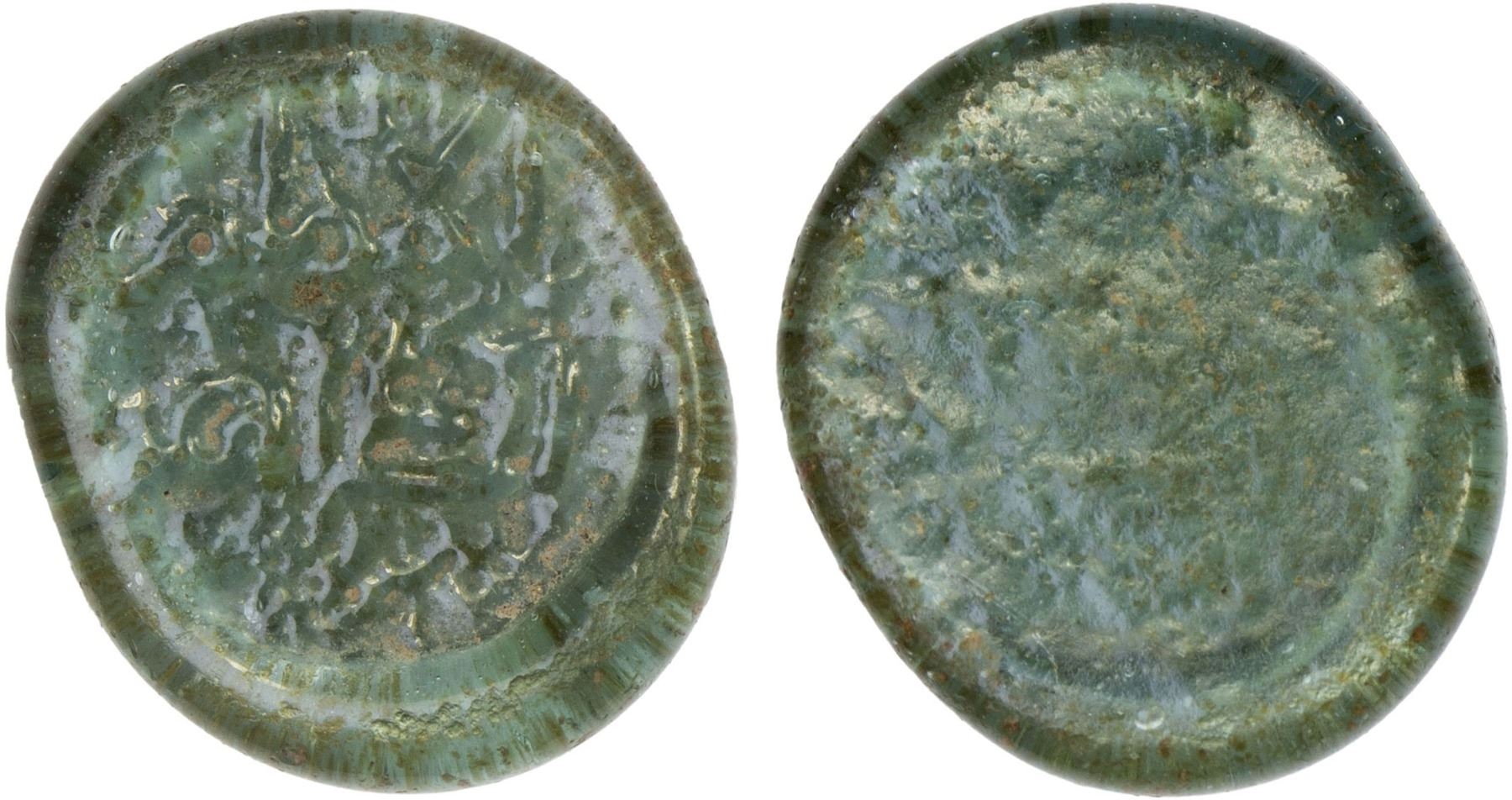FATIMID: al-Zahir, 1021-1036, glass weight (jeton) (0.74g), A-718, FGJ-180, legend al-imam / al-zahir, light green, translucent, strong VF, R, ex Ismail al-Imam Collection.