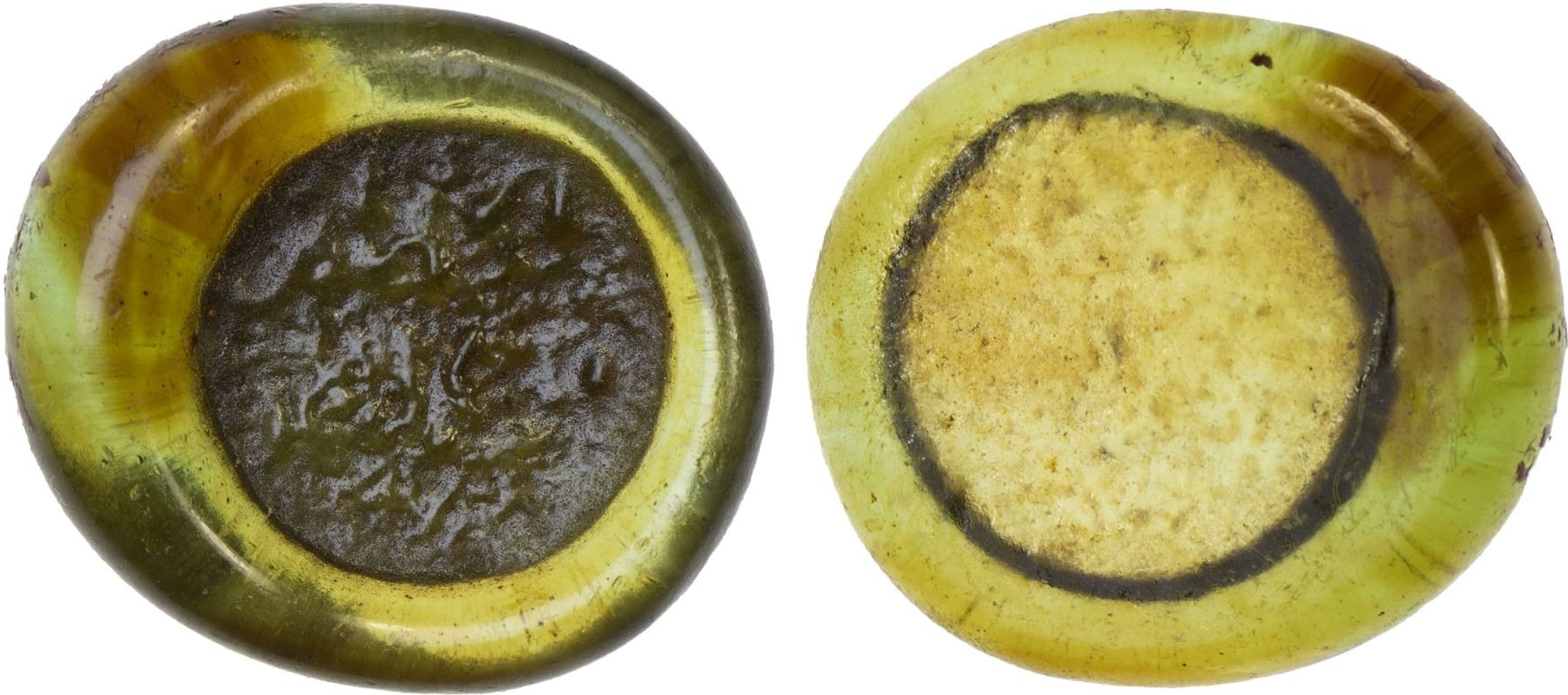 FATIMID: al-Zahir, 1021-1036, glass weight (jeton) (1.49g), A-718, FGJ-201/203, ruler cited as al-imam / al-zahir; brownish green, translucent, some devitrification, VF, ex SARC Auction 12, lot 306 (incorrectly assigned to al-Mustansir FGJ-269), ex Ismail al-Imam Collection.