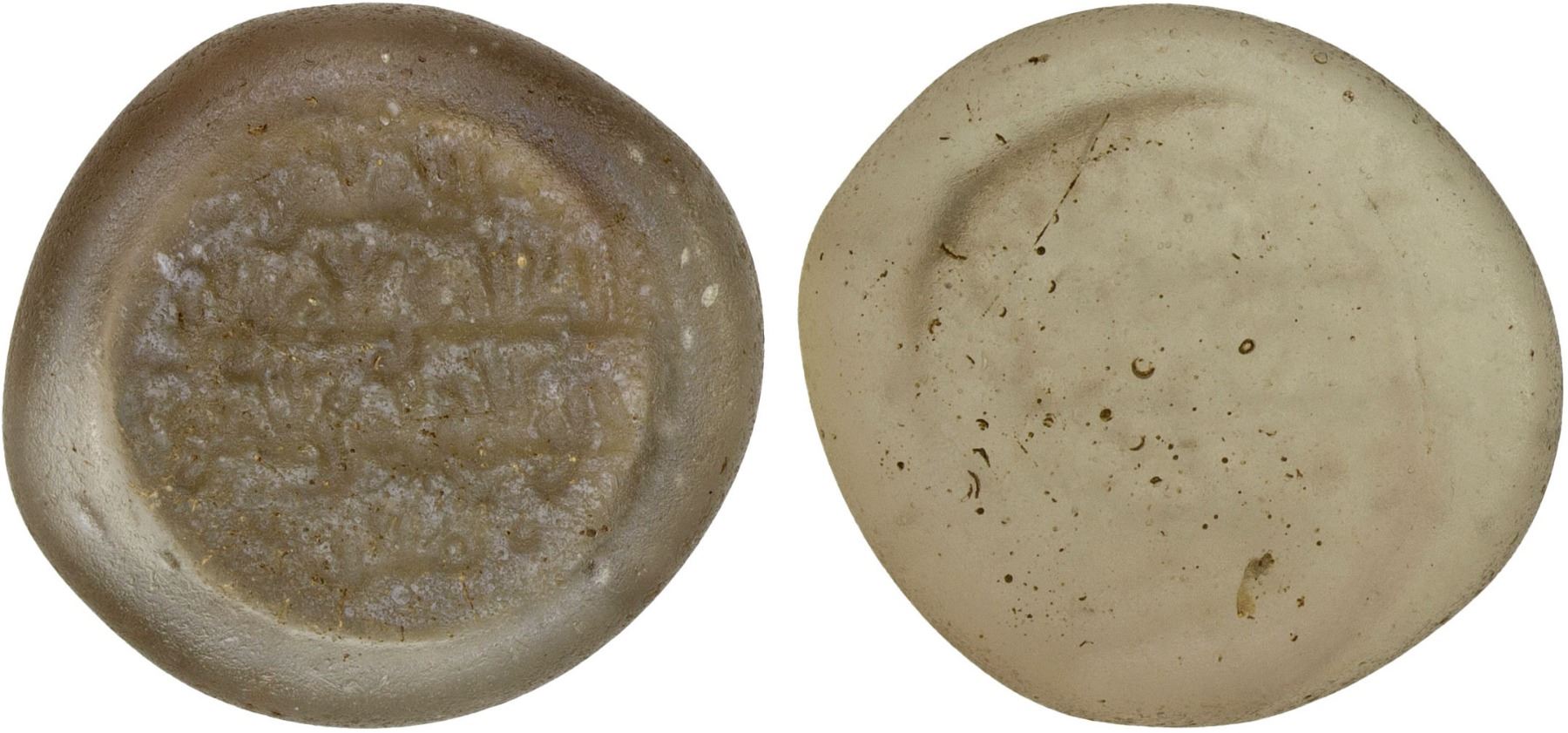 FATIMID: al-Zahir, 1021-1036, glass weight (jeton) (2.86g), A-718, FGJ-194, legend al-imam / al-zahir li-a'zaz / din Allah amir al-mu'- / -minin, uniface, slightly green cream color, slight devitrification, translucent, VF, ex SARC Auction 12, lot 287, ex Ismail al-Imam Collection.
