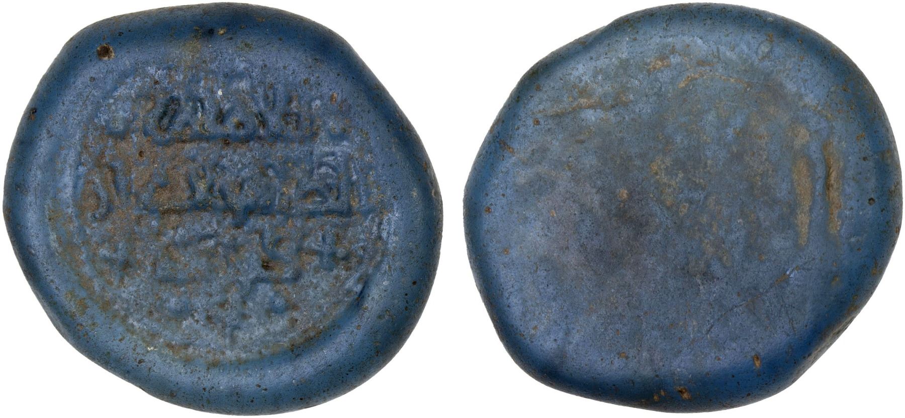 FATIMID: al-Zahir, 1021-1036, glass weight (jeton) (2.96g), A-718, as FGJ-212, but blank reverse, legend al-imam / al-zahir li-a'zaz / din Allah, brown but revealing deep blue when viewed before a light, translucent, good Fine, R, ex Ismail al-Imam Collection.