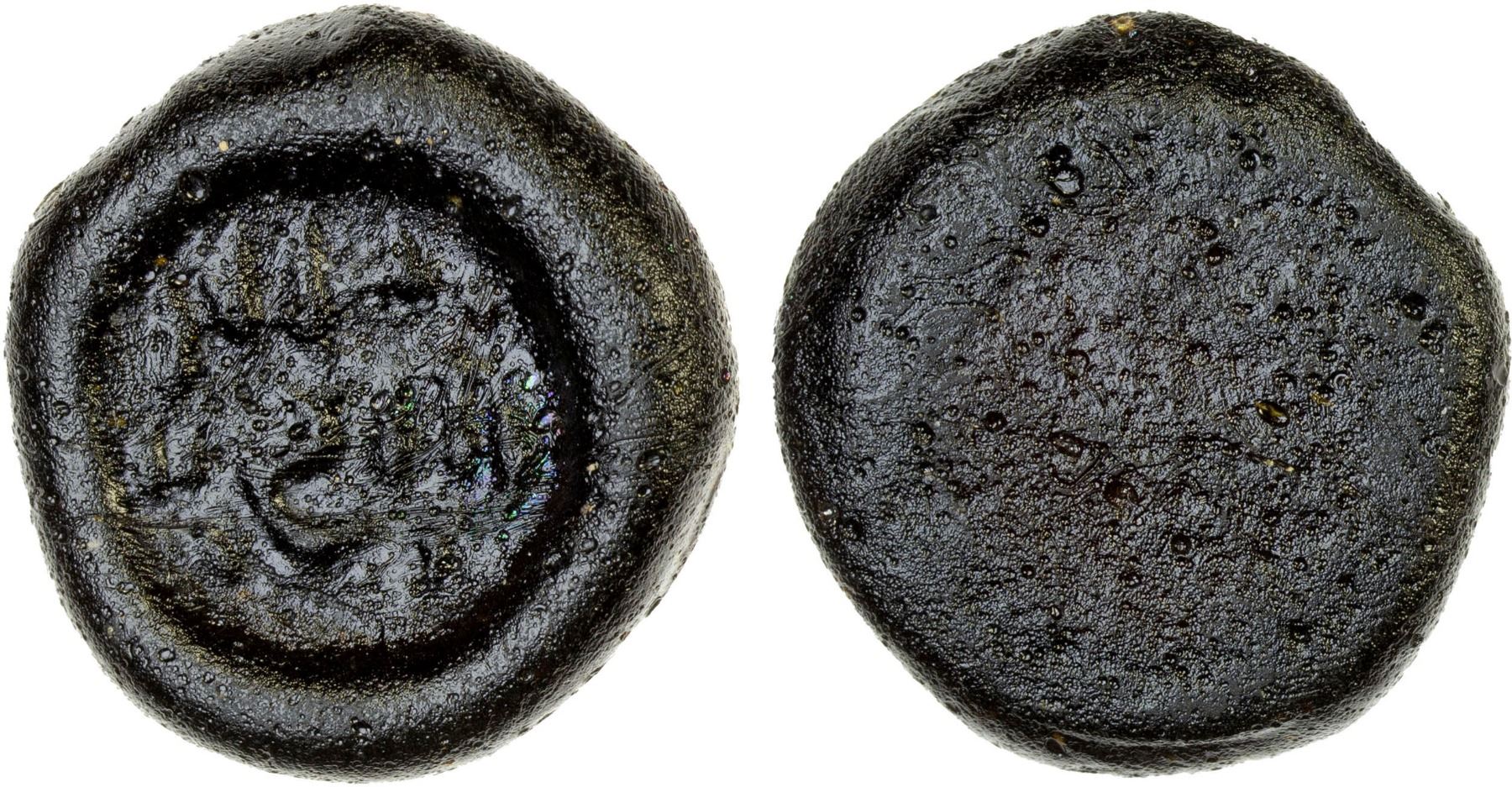 FATIMID: al-Zahir, 1021-1036, glass weight (jeton) (5.29g), A-718, FGJ-181-style, legend resembling al-zahir / li-a'zaz din Allah, uniface, deep brown, almost opaque, possibly not of al-Zahir, but some later Fatimid Imam but the name insufficiently clear, VF, ex SARC Auction 12, lot 286, ex Ismail al-Imam Collection.