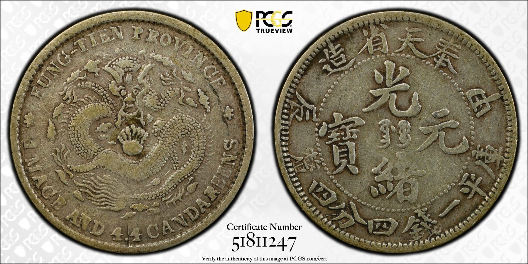 FENGTIEN: Kuang Hsu, 1875-1908, AR 20 cents, Fengtien Arsenal mint, CD1904, Y-91.1, L&M-485, eight rows of scales variety, PCGS graded VF25.