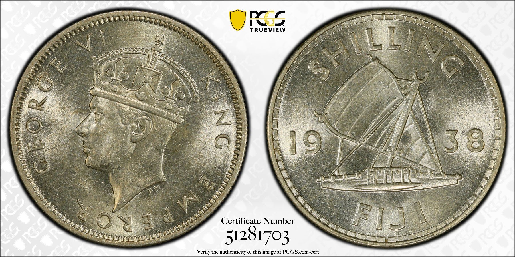FIJI: George VI, 1936-1952, AR shilling, 1938, PCGS MS62
