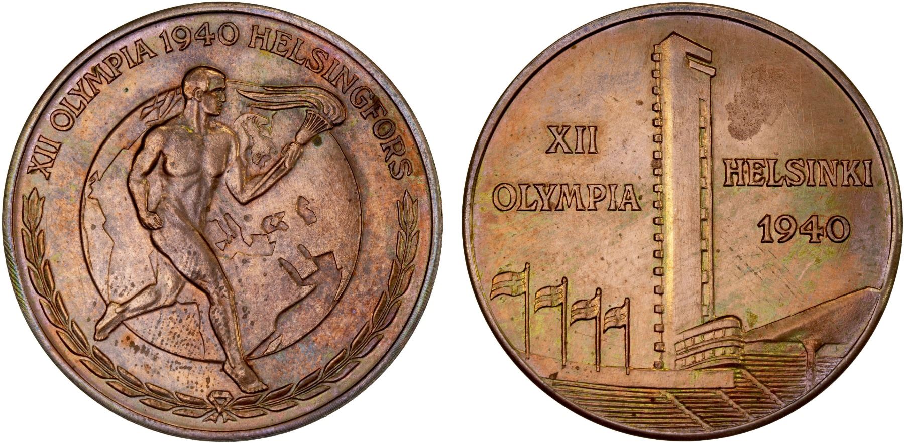 FINLAND: AE medal (13.62g), 1940, 37mm bronze participant's medal for the Cancelled Helsinki Summer Olympic Games, nude male torchbearer rinning right with globe showing Finland behind, XII OLYMPIA 1940 HELSINGFORS around with stylized laurel wreath below // Olympic Stadium and tower with XII / OLYMPIA in left field and "HELSINKI / 1940" in right field, lightly cleaned, light reverse oxidation, plain edge, Unc. These medals were struck on November 30, 1939, and, after the war, were sold for the benefit of the Viipuri district of the Finnish Gymnastics and Sports Federation. They are quite scarce.