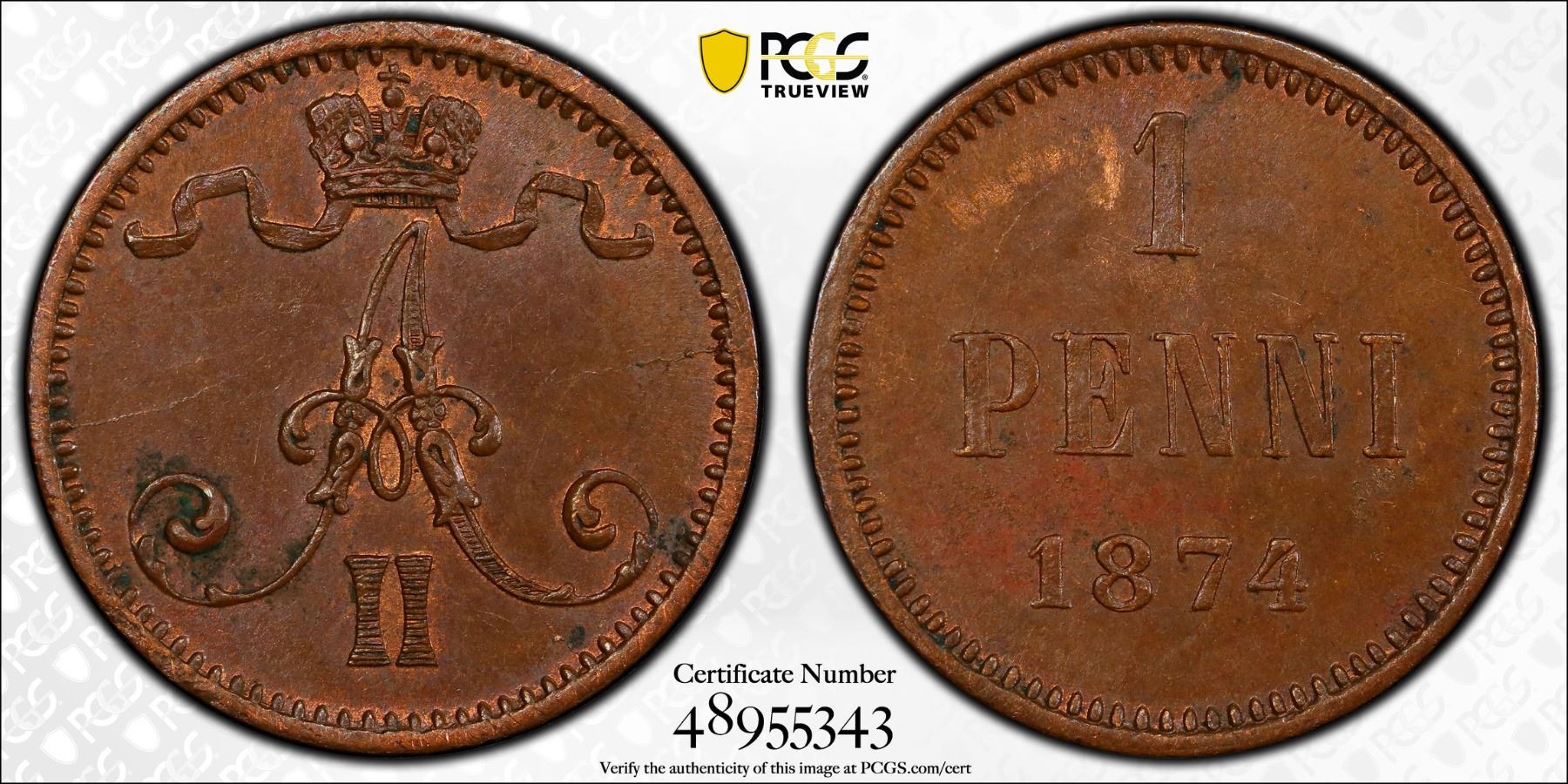 FINLAND: Alexander II, 1855-1881, AE penni, 1874, KM-1, PCGS graded MS62 BN.