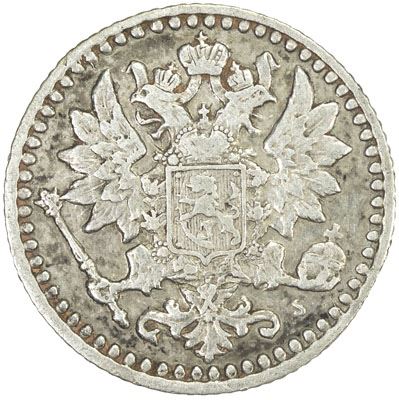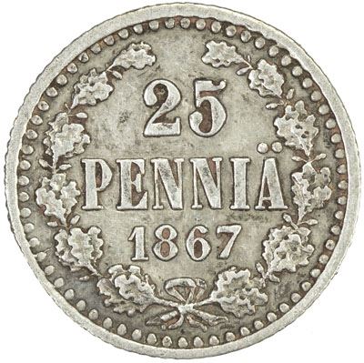 FINLAND: Alexander II, 1855-1881, AR 25 penniä, 1867, KM-6.1, Sieg-31, initial S, key date, About VF, ex Dr. John Lund Collection.
