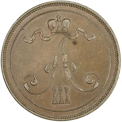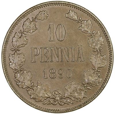 FINLAND: Alexander III, 1881-1894, AE 10 penniä, 1890, KM-12, Sieg-23, brown, better date, About Unc, ex Dr. John Lund Collection.