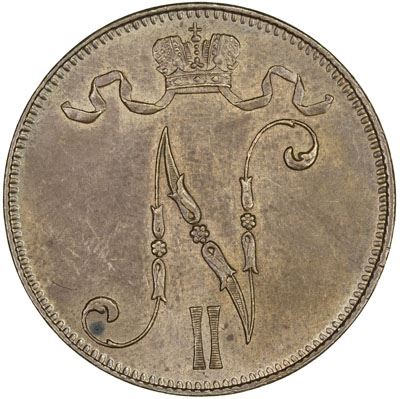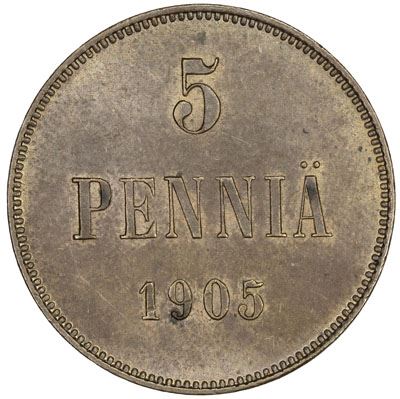 FINLAND: Nicholas II, 1894-1917, AE 5 penniä, 1905, KM-15, Sieg-12, brown, a few small spots, Unc, ex Dr. John Lund Collection.
