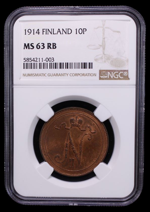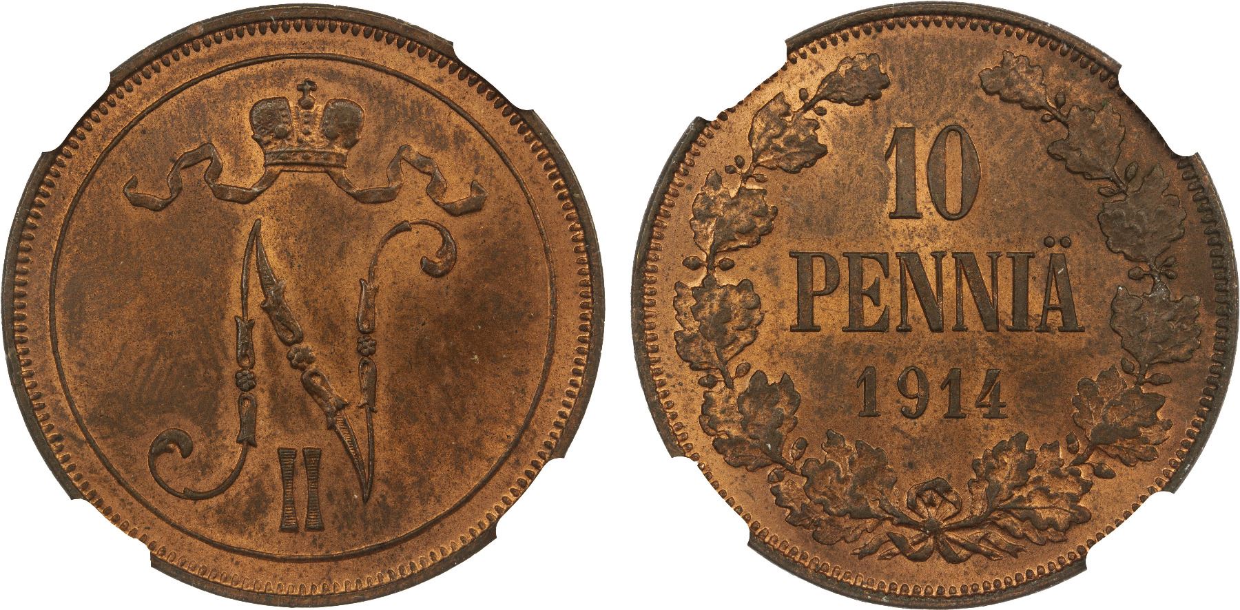 FINLAND: Nicholas II, Grand Duke, 1894-1917, AE 10 penniä, 1914, NGC MS63 RB