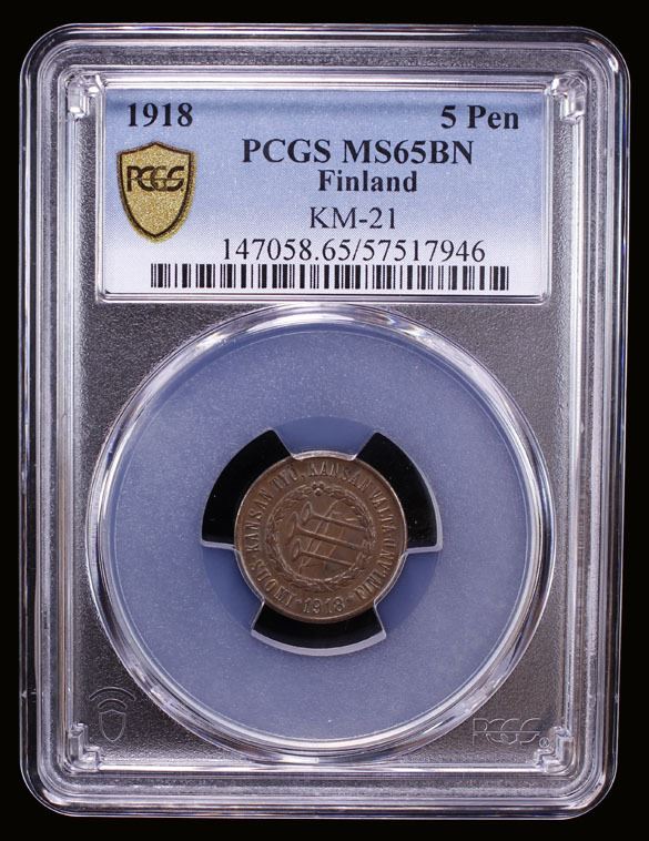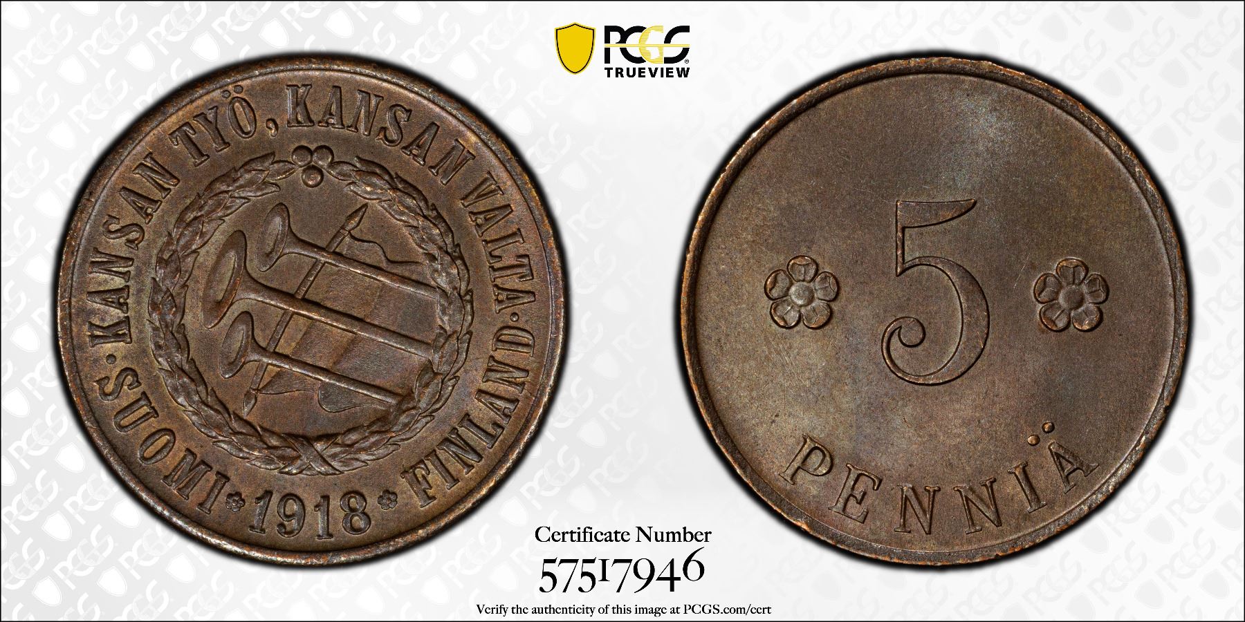 FINLAND: Socialist Workers' Republic, AE 5 penniä, 1918, KM-21, flag and three trumpets with legend "Kansan Työ, Kansan Valta" (People's Work, People's Power), a superb mint state example! PCGS graded MS65 BN. The Finnish Socialist Workers' Republic (FSWR), more commonly referred to as Red Finland, was a self-proclaimed socialist state in Finland during the Finnish Civil War from January to May 1918.