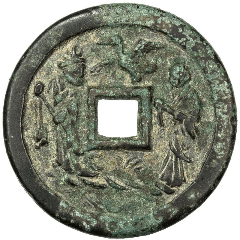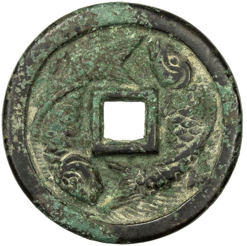 FIVE DYNASTIES: AE charm, 57mm, two gods / two fish, light encrustation from burial, VF, RR. Assignment of this to the Five Dynasties and Ten Kingdoms (907-960) period is tentative and only by style. It could possibly also be issued during the Song period as well. Photo size reduced.