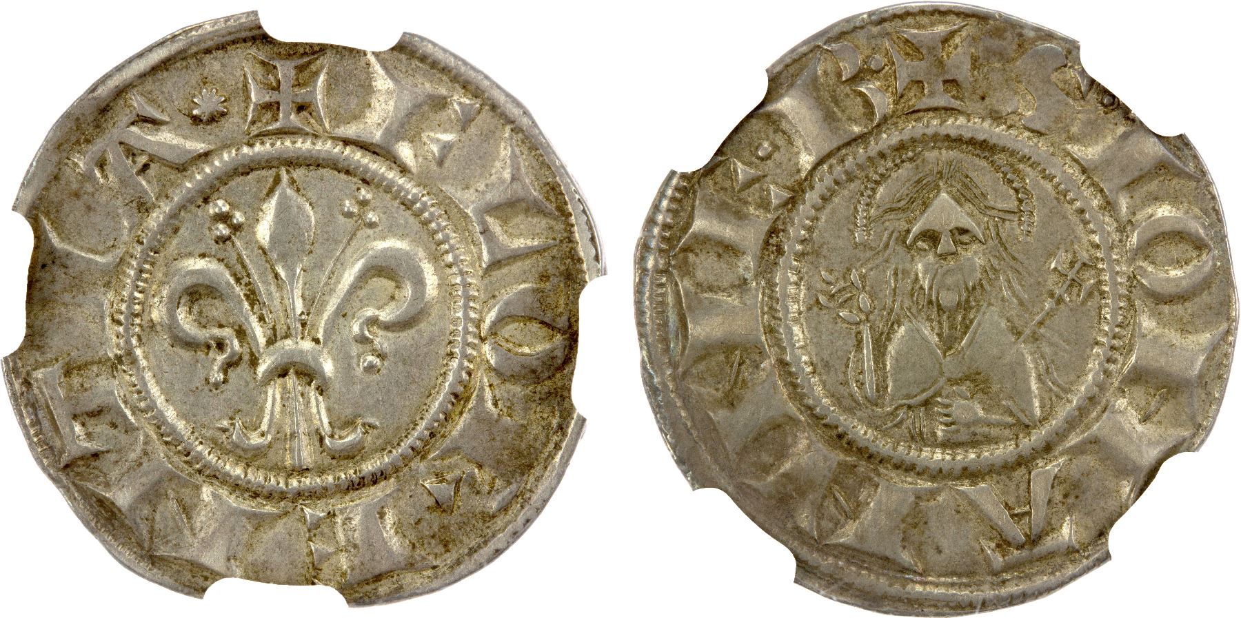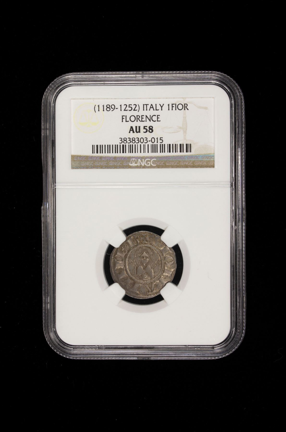 FLORENCE: Republic, AR fiorino di stella, MIR-38; Biaggi-783, ornate Lily of Florence // bust of St. John the Baptist facing, holding cross-tipped scepter and raising hand in benediction, a lovely nearly mint state example! NGC graded AU58.