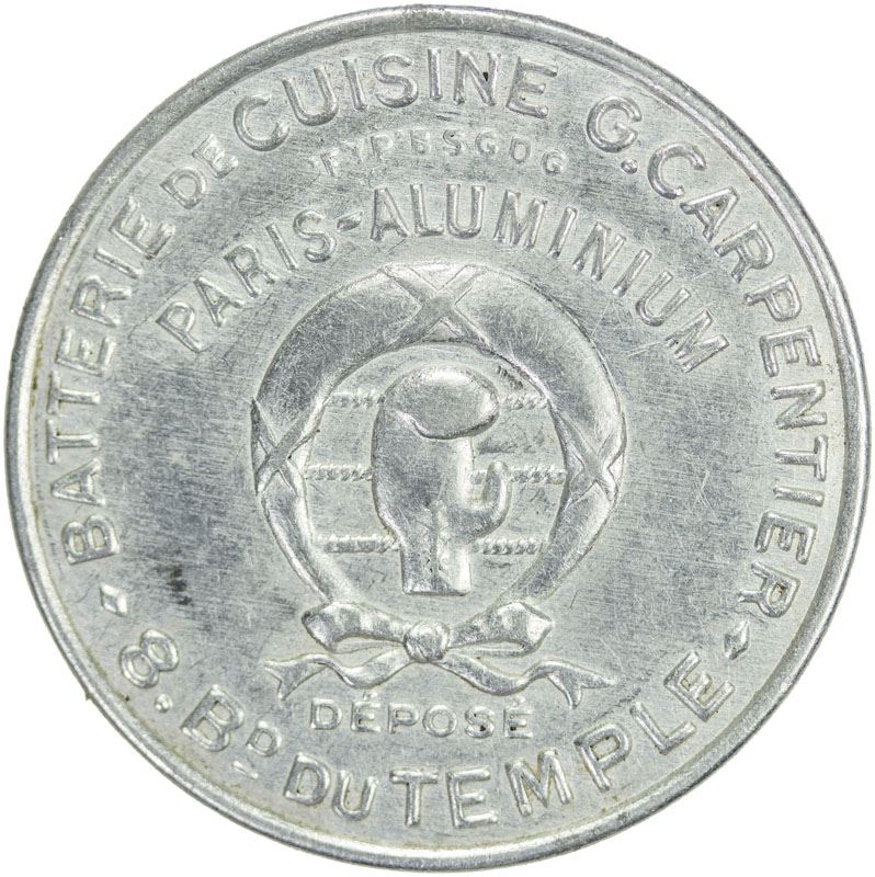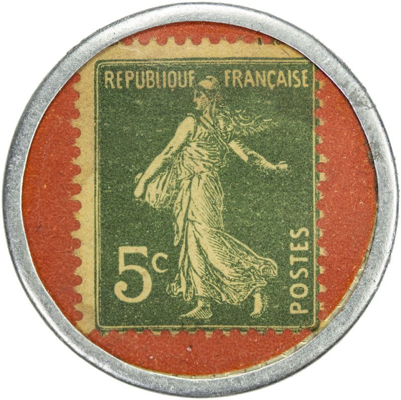 FRANCE: 5 centimes encased postage, ND (ca. 1920), cf. Broustine pg. 52, Batterie Cuisine Carpentier, Paris, green Scott-159 stamp with red background, aluminum case, About EF, S.