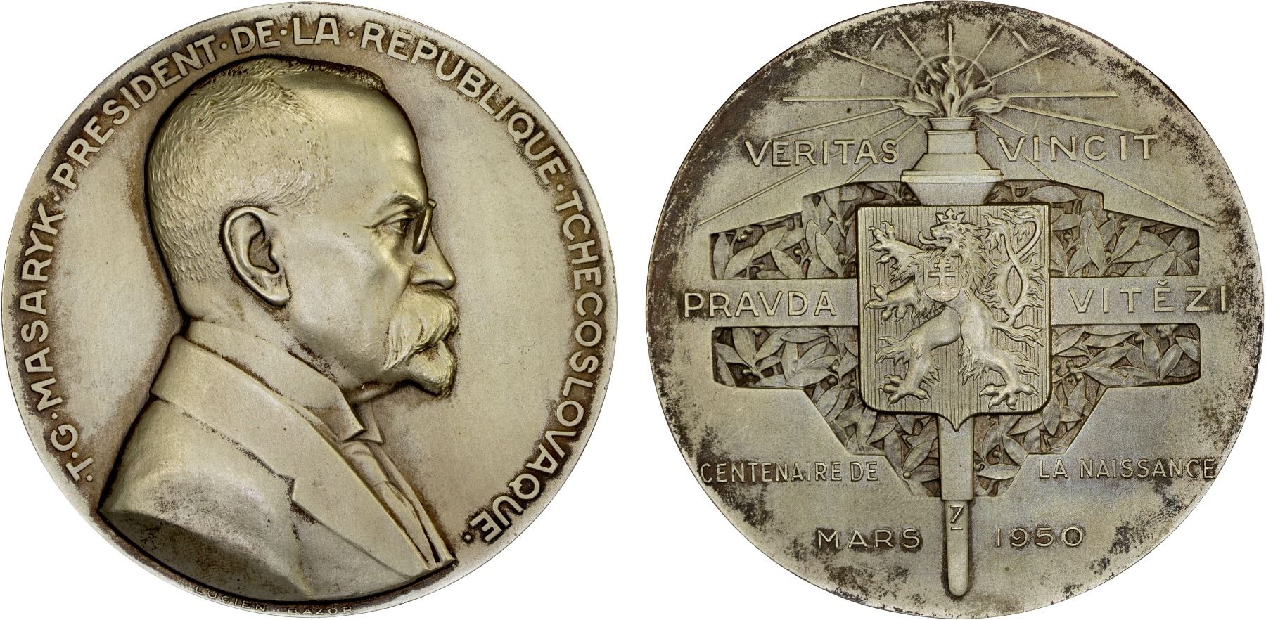 FRANCE: AE medal (144.44g), 1950, 72mm silvered bronze (?) medal for President T. G. Masaryk by Lucien Bazor, bust right with T G MASARYK PRESIDENT DE LA REPUBLIQUE TCHECOSLOVAQUE around // Czech arms with radiant torch behind with "VERITAS - VINCIT / PRAVDA - VITEZI / CENTENAIRE DE - LA NAISSANCE / MARS 7 1950" at sides, starting to tone, plain edge, Choice UNC. We were unable to find any other examples of this metal in the online resources.