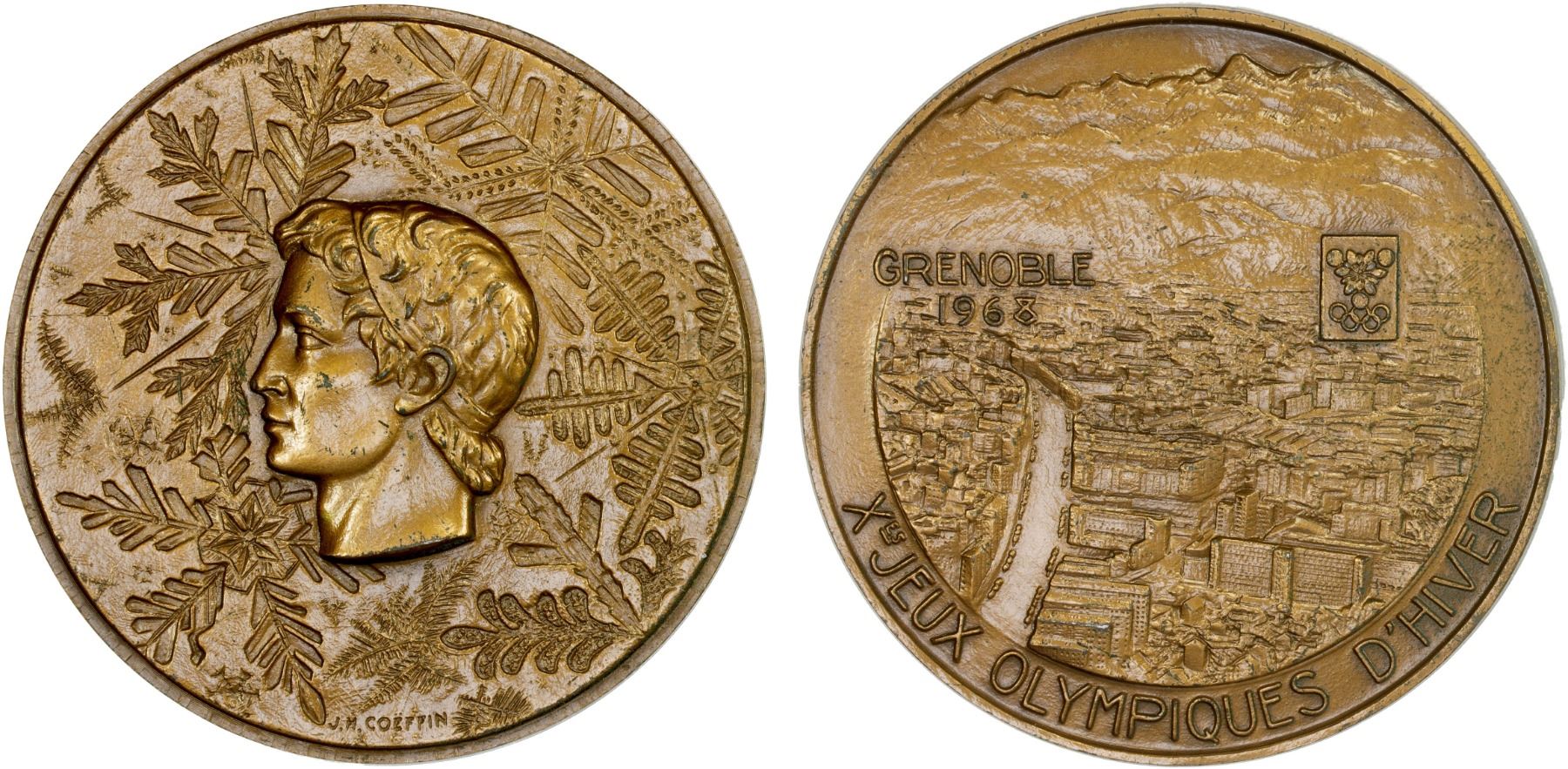 FRANCE: AE medal (154.6g), 1968, 68mm bronze Official Participant's medal for the 1968 Grenoble Winter Olympic Games by J. H. Coeffin, cityscape of Grenoble with mountains behind at top and GRENOBLE / 1968 at left and Olympic symbol at right and Xes JEUX OLYMPIQUES D'HIVER around below // male youth bust left with different shapes of snowflakes behind, lightly lacquered, "1967 BRONZE" with cornucopia privy mark on edge, Unc.