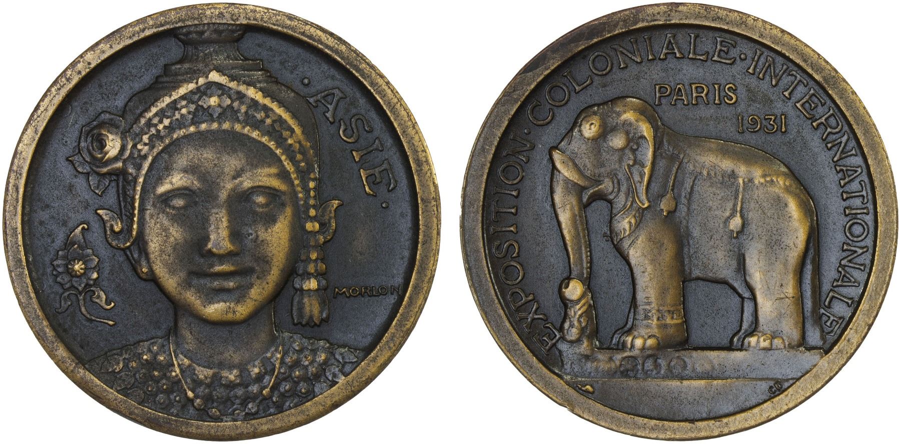 FRANCE: AE medal, 1931, N-18955, 32mm bronze medal by Pierre-Alexandre Morlon for the Paris International Colonial Exhibition; ASIE above woman in traditional headdress facing forward with lotus flower at left // EXPOSITION COLONIALE INTERNATIONALE around decorated statue of elephant left, struck at the Monnaie de Paris, matte finish type, AU. The exposition opened on 6 May 1931 in the Bois de Vincennes on the eastern outskirts of Paris. The scale was enormous. It is estimated that from 7 to 9 million visitors came from over the world. The French government brought people from the colonies to Paris and had them create native arts and crafts and perform in grandly scaled reproductions of their native architectural styles such as huts or temples. Other nations participated in the event, including The Netherlands, Belgium, Italy, Japan, Portugal, the United Kingdom, and the United States.