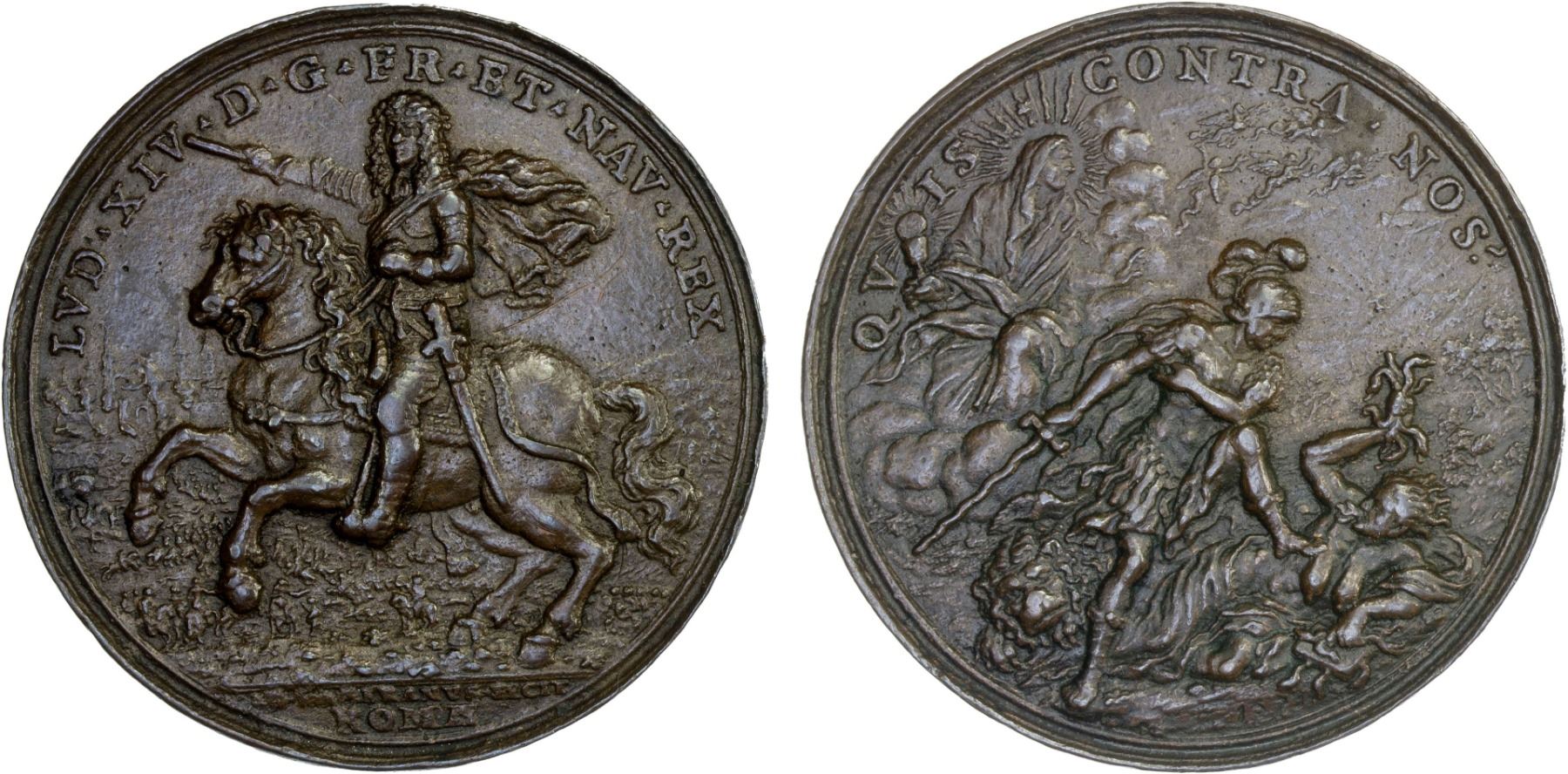 FRANCE: AE medal (29.04g), 1673, Forrer II, 403, 43mm cast bronze medal for the Massacre of the Huguenots in the Cévennes by Giovanni Hamerani, Louis XIV on horseback left, pointing to a besieged city with his commander's baton with LVD XIV D G FR ET NAV REX around and IO.HAMERANVS. FECIT / ROMÆ in exergue // warrior with lion at his feet vanquishing Heresy, with the Virgin Mary behind in the clouds with QV - IS CONTRA NOS around and "1673" incuse at bottom, light obverse scratch, later cast, but attractive, plain edge, XF.