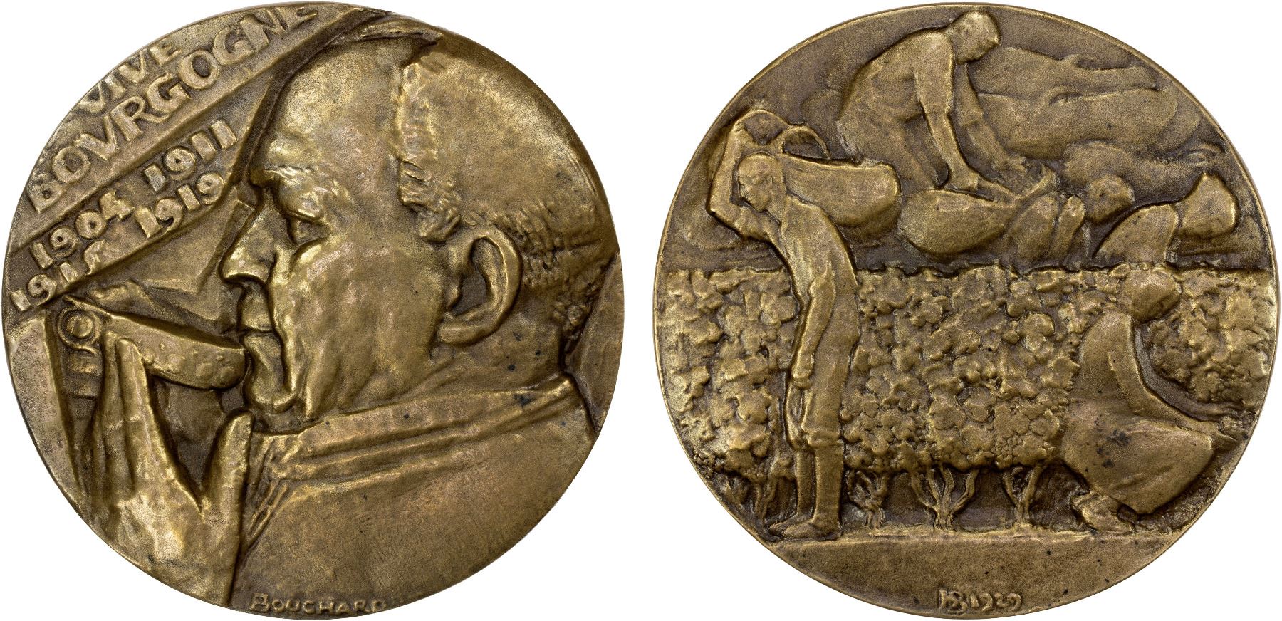 FRANCE: AE medal (447.3g), 1929, Maier-310, 109mm, cast bronze medal as Tribute to the Great Burgundy Wines of 1904, 1911, 1915, and 1919, by Henri Bouchard, bust of man tasting with a sommelier's cup left with VIVE / BOVRGOGNE / 1904 1911 / 1915 1919 at upper left // harvest scene in Burgundy with hB monogram and "1929" at bottom, hallmark and "99" stamped on edge, XF, R.