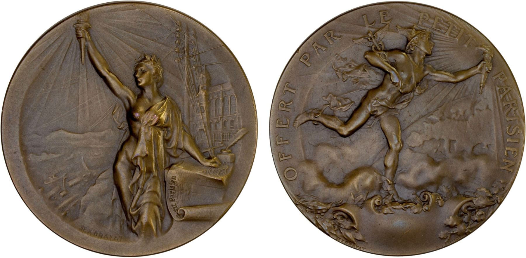 FRANCE: AE medal (50.69g), ND (ca. 1900), Forrer VII, 284, 50mm bronze Art Nouveau medal of Mercury by Étienne Victor Exbrayat for the newspaper Offert par le Petit Parisien, semi nude woman wearing laurel wreath and holding a raised radiant torch, with her left hand resting on a copy of the Petit Parisien newspaper, with inkwell and pen behind and telegraph pole and publishing house in background //semi-nude Mercury wearing winged helmet and winged shoes advancing right on clouds to the right, holding radiant torch in left hand and caduceus in his right hand, with map of Europe in the background and laurel and oak sprays below, and with OFFERT PAR LE PETIT - PARISIEN around (BRO)NZE and unidentified privy mark on edge, Choice Unc. Struck for the French daily newspaper Offert par le Petit Parisien (1870-1940). After World War II, it was forced to close because of collaboration with the Nazis during the war.