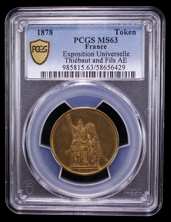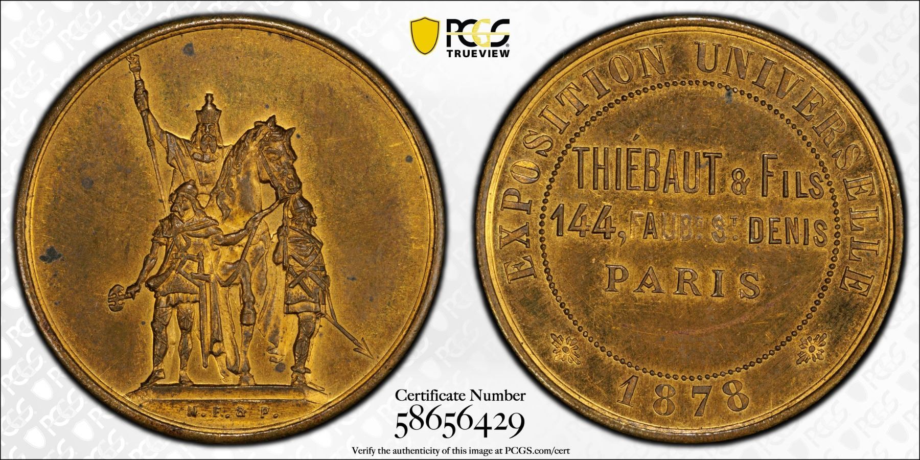 FRANCE: AE token (7.44g), 1878, N-123710, 27mm brass advertising token for Thiébaut & Fils; Charlemagne et ses Leudes Statue by the Rochet Brothers, N. F. & P. inscribed on the base // EXPOSITION UNIVERSELLE 1878 in outer legend, THIÉBAUT & FILS / 144, FAUBG ST. DENIS / PARIS, a lovely mint state example! PCGS graded MS63. Charlemagne et ses Leudes (Charlemagne and His Guards) is a monumental bronze statue situated on the plaza (parvis) in front of Notre-Dame, in the 4th arrondissement of Paris, France. A joint work by the brothers Louis Rochet (1813-1878) and Charles Rochet (1815-1900), it was cast at the art foundry Fonderie Thiébaut Frères, known at that time as Thiébaut et Fils.
