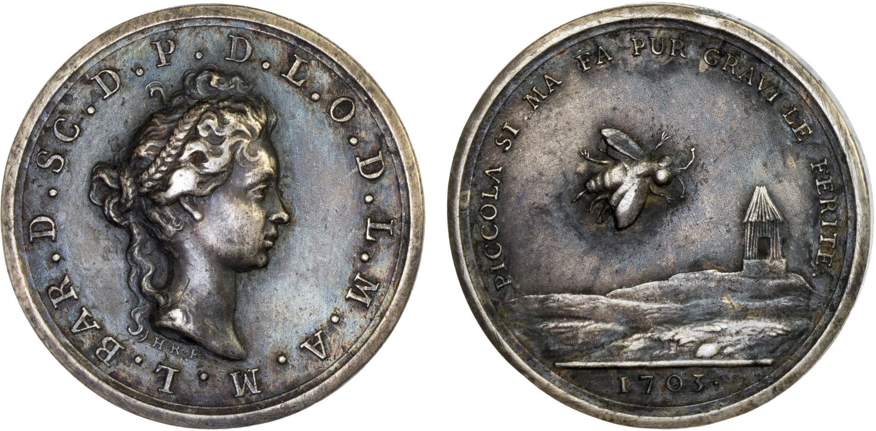 FRANCE: AR jeton, Paris, "1703", jeton by H. Roussel, obverse in high relief with Duchesse du Maine bust right surrounded by D. L. O. D. L. M. A. M. L. BAR. D. SC. D. P./bee flying towards beehive on hillock in background with surrounding legend PICCOLA SI. MA FA PUR GRAVI LE FERITE. and 1703. in exergue, 28 mm, pointing hand edge punch, toned, could be antiqued finish, VF-XF. These jetons were apparently struck ca. 1850.