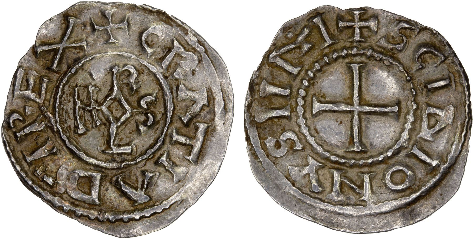 FRANCE: CAROLINGIAN: Charles, the Bald, 840-877, AR denier (1.81g), Saint-Denis, MEC-I/897, Karolus monogram, + GRATIA D-I REX // cross pattée, + SCI DIONYSII M, bold strike, slightly wavy flan, XF-AU, ex Andy Singer.