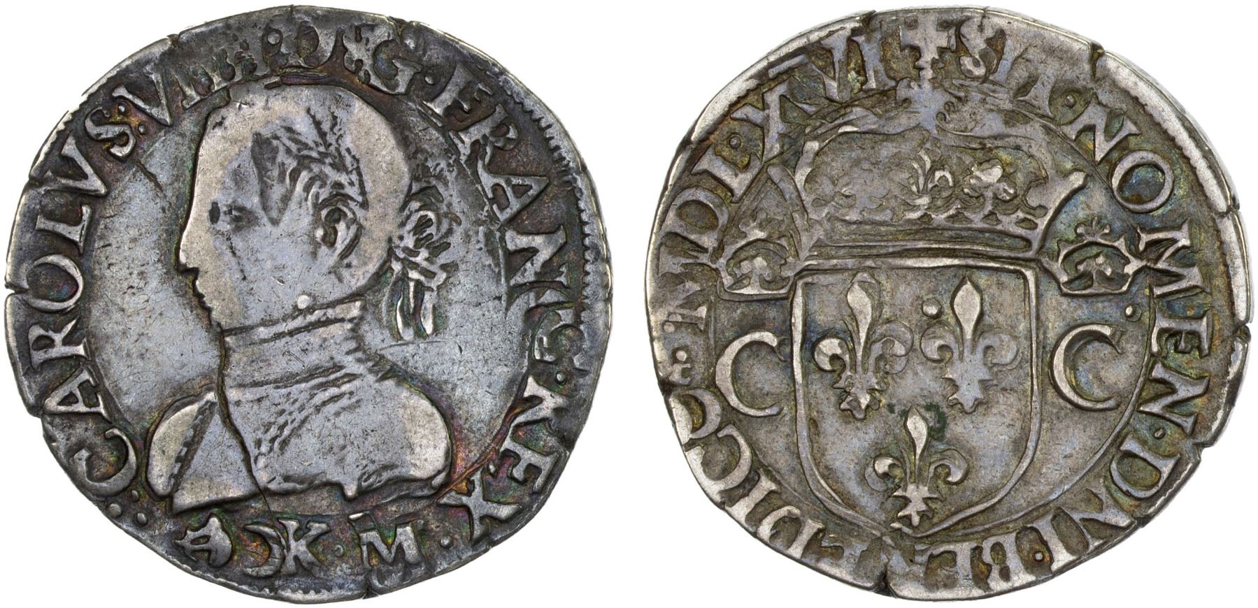 FRANCE: Charles IX, 1560-1574, AR teston (9.32g), Toulouse, 1566-M, Duplessy-1063var, variety with hair tied at back, with two symbols and "K" below bust, obverse legend as CAROLUS XIIII..., and reverse legend as SIT NOMEN DNI..., nicely toned, F-VF.