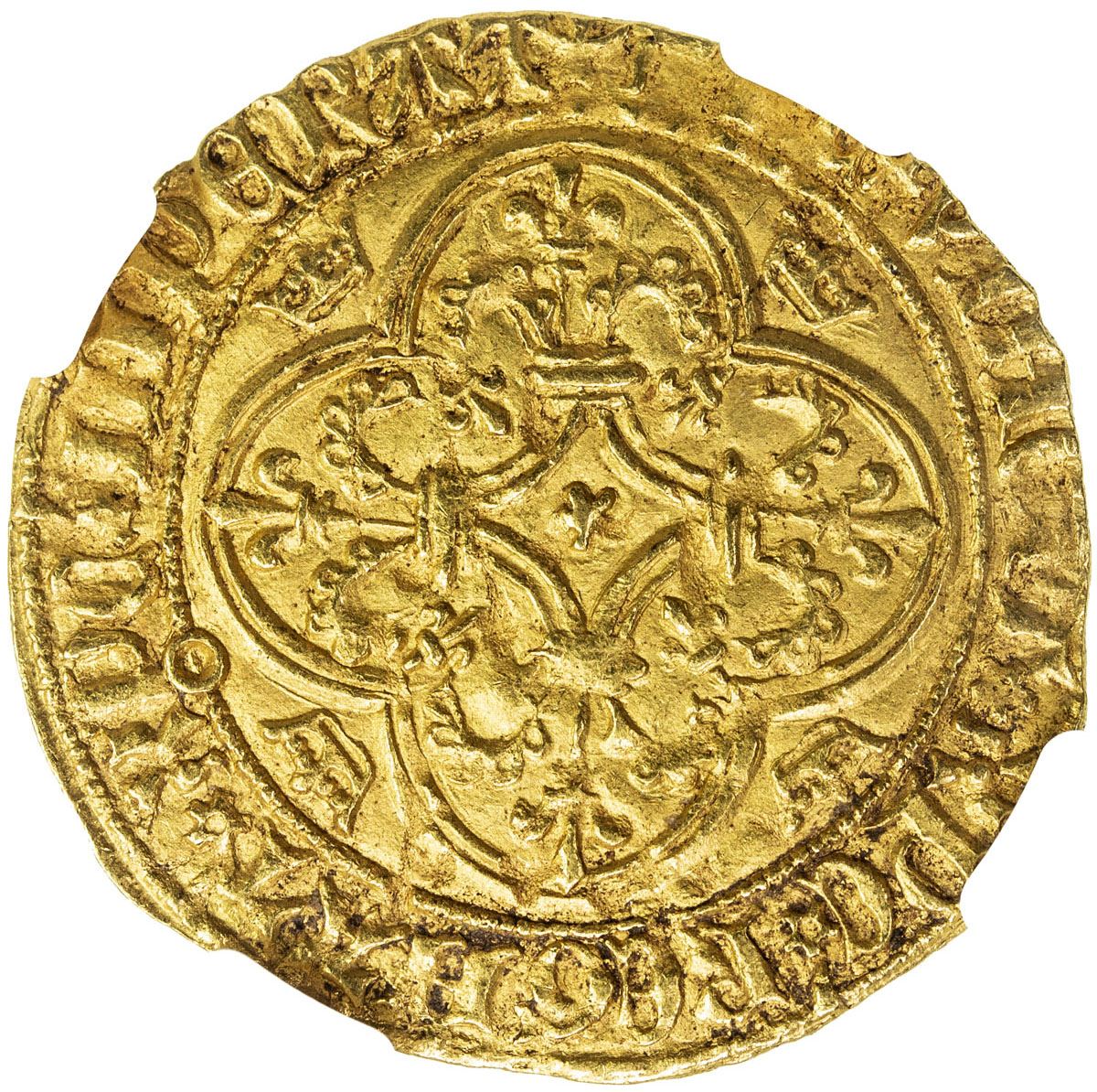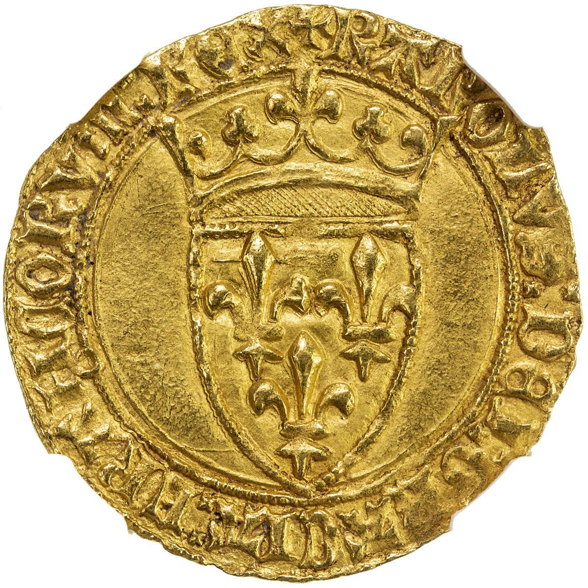 FRANCE: Charles VI, 1380-1422, AV ecú d'or à la couronne (3.80g), Fr-291, crowned arms, + KAROLVS DEI GRACIA FRANCORVM REX // cross fleurée, with star in center and inward-facing lis in each angle, all within double polylobe, with crown in each spandrel, + XPC VINCIT XPC REGNAT XPC INPERAT, sharply struck and well centered, tied for second highest graded by NGC, NGC graded MS64.