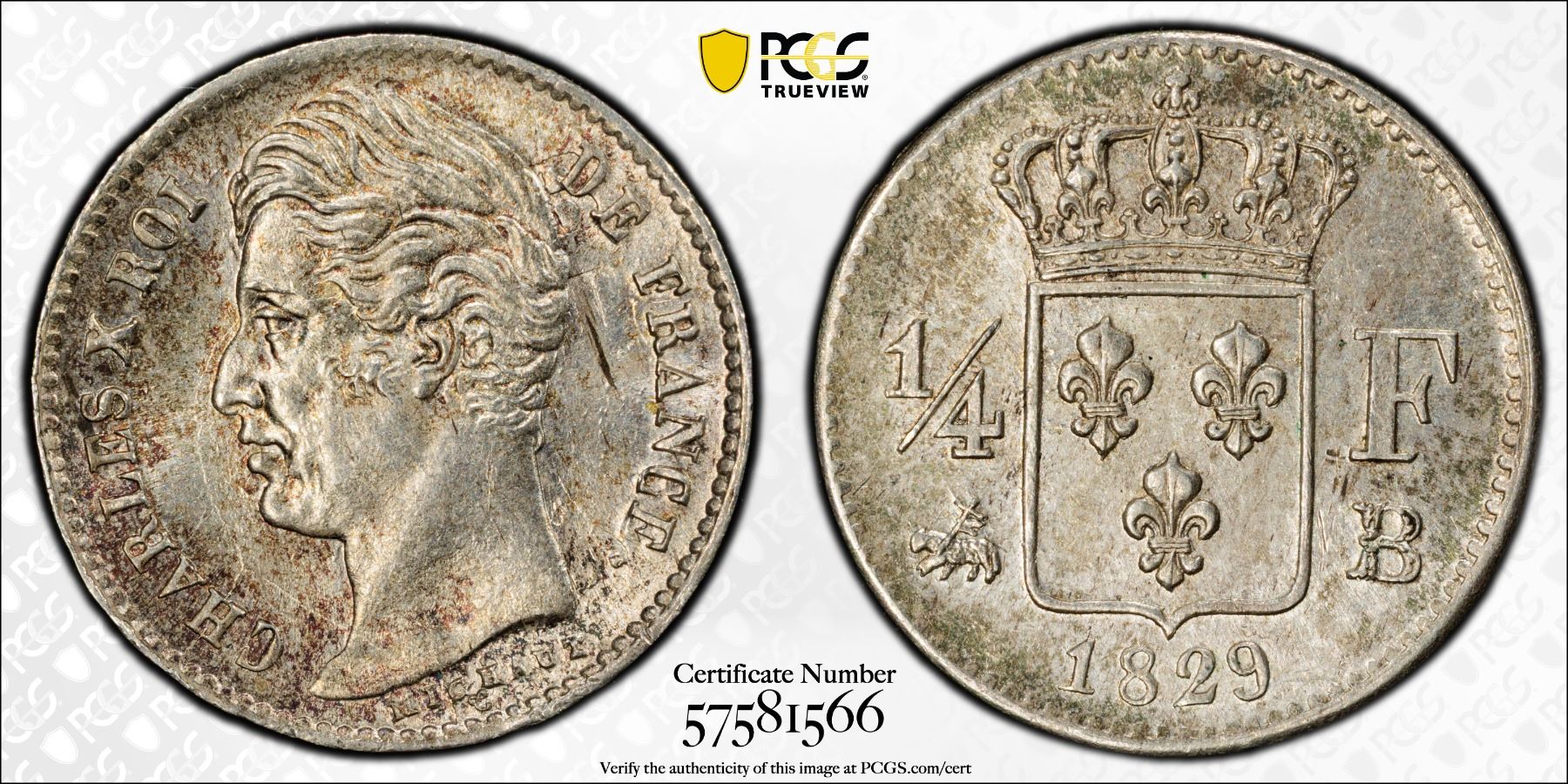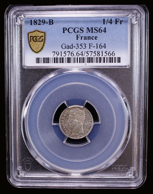 FRANCE: Charles X, 1824-1830, AR 1/4 franc, 1829-B, PCGS MS64